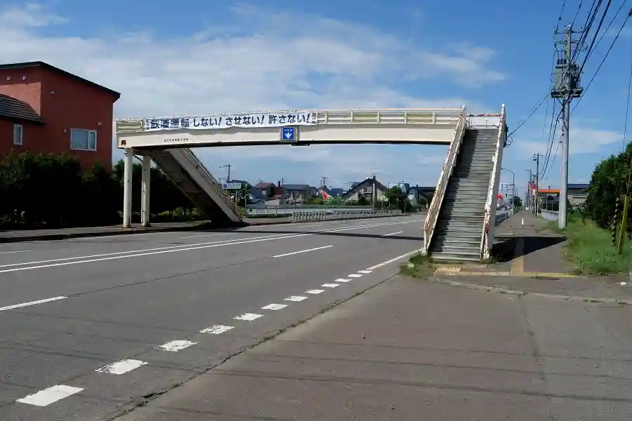 写真奥から手前に走ってくると歩道橋の下り階段の左側に鳥居が