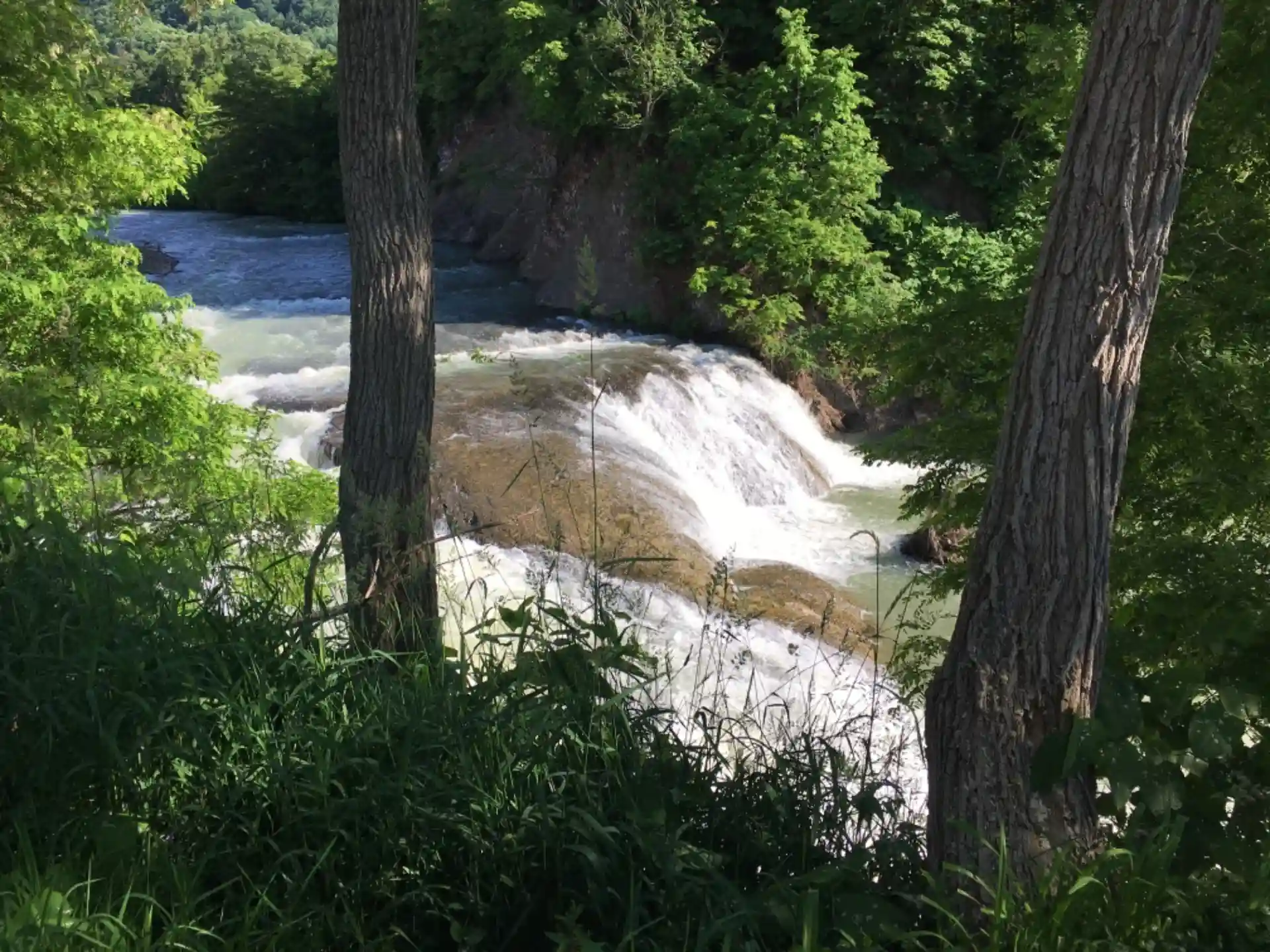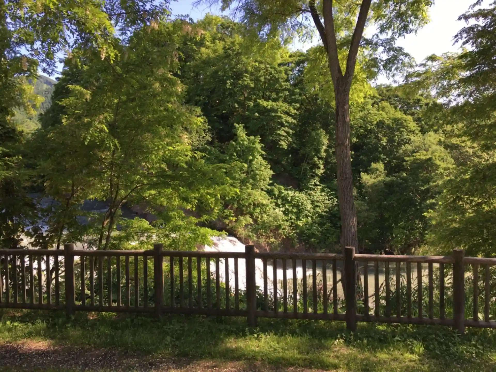 滝に下りる通路は閉鎖されているようで、上から眺めることしかできませんが、看板によると川の切替工事の際にできた人工の滝だそうで、なかなかの迫力です。
