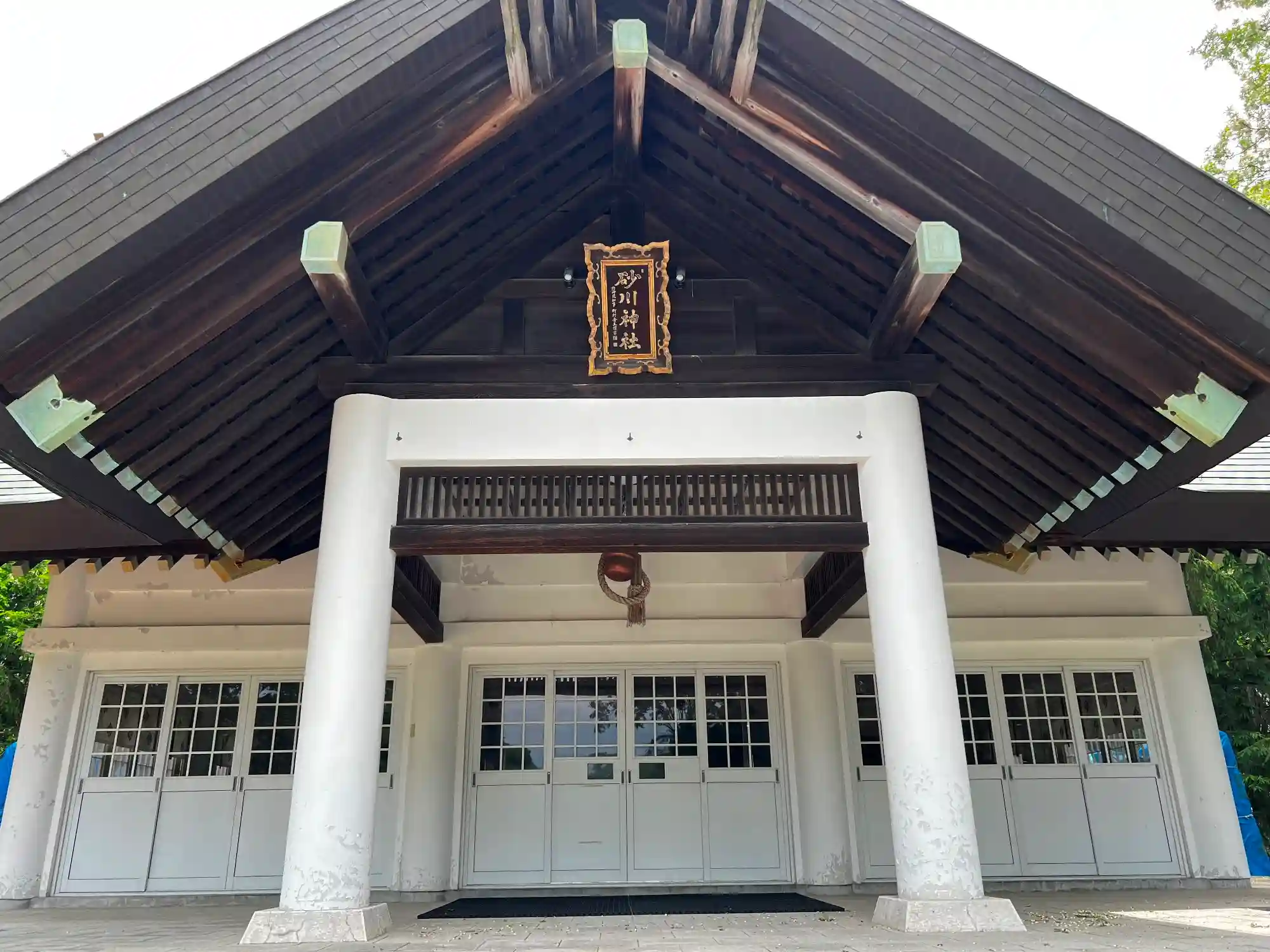 当社は、JR函館本線・砂川駅の南東600mの低い台地上にある。境内入口は西側の低地にある大鳥居と、南側の高台にある大鳥居がある(どちらが正式な入口かは、社号標を見付けられなかったので結局分からず)。広い境内は樹木も多いが、参道の幅が広いので明るい造り。社殿も大きい。