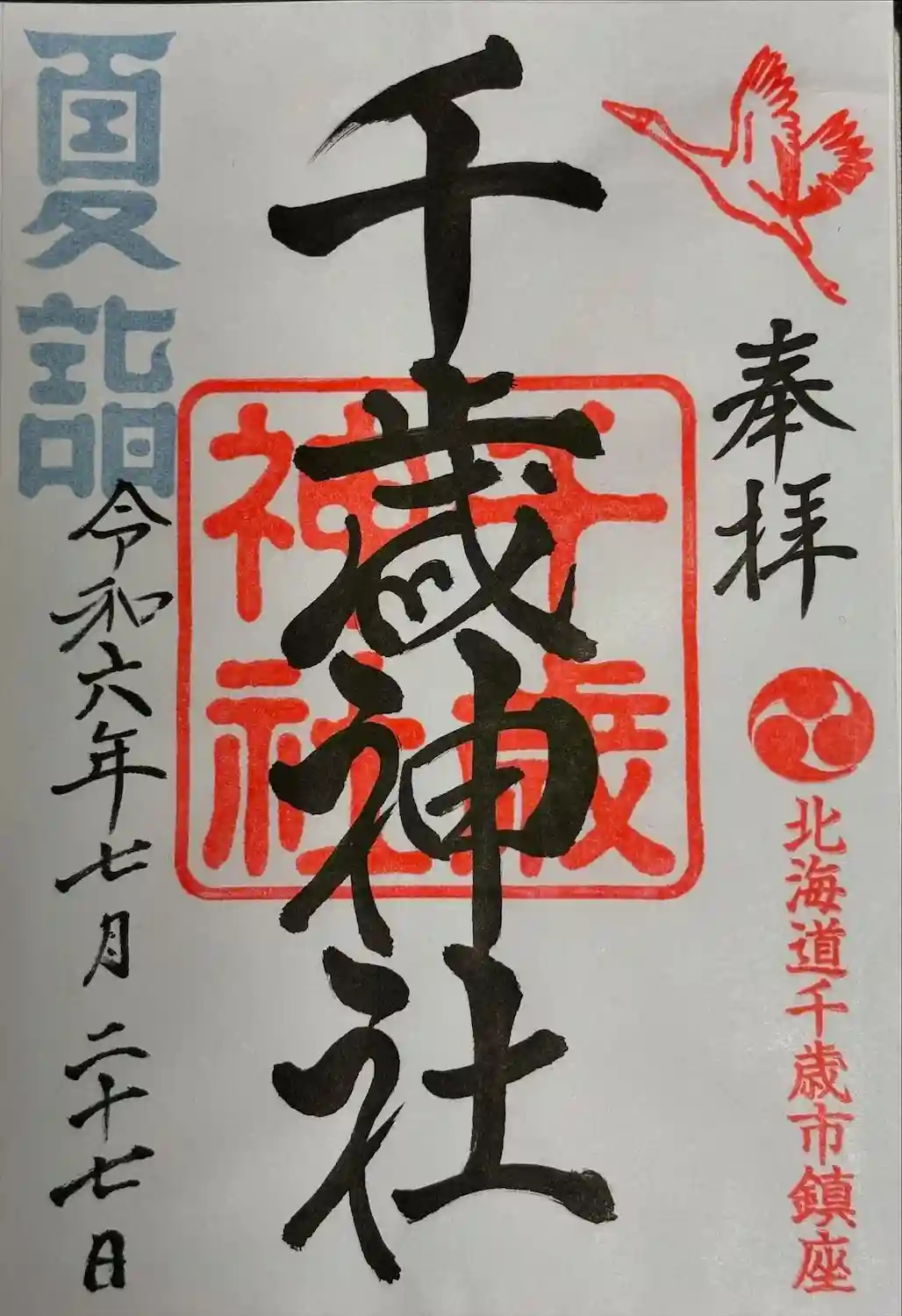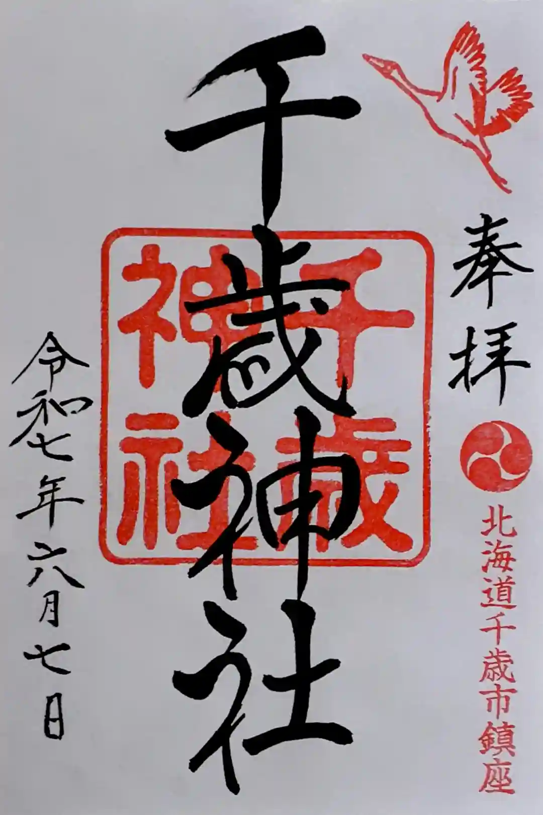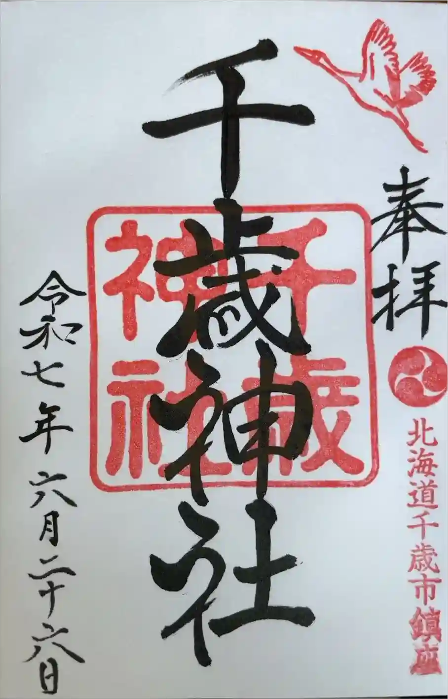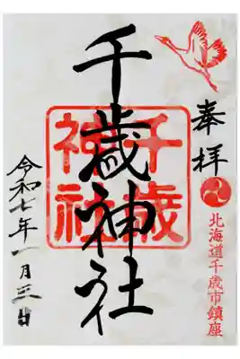 右上にび立つ鶴が描かれた印、右下に三つ巴紋と北海道千歳市鎮座と書かれた印が押されています。