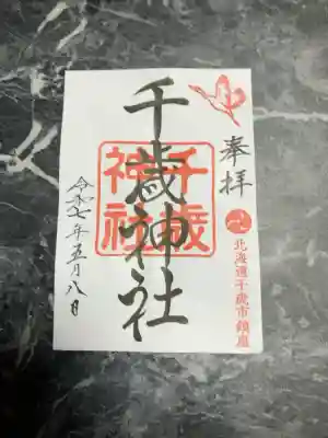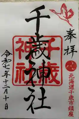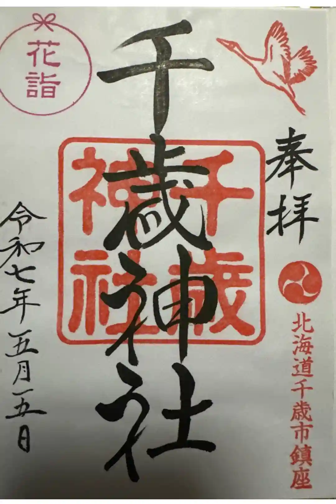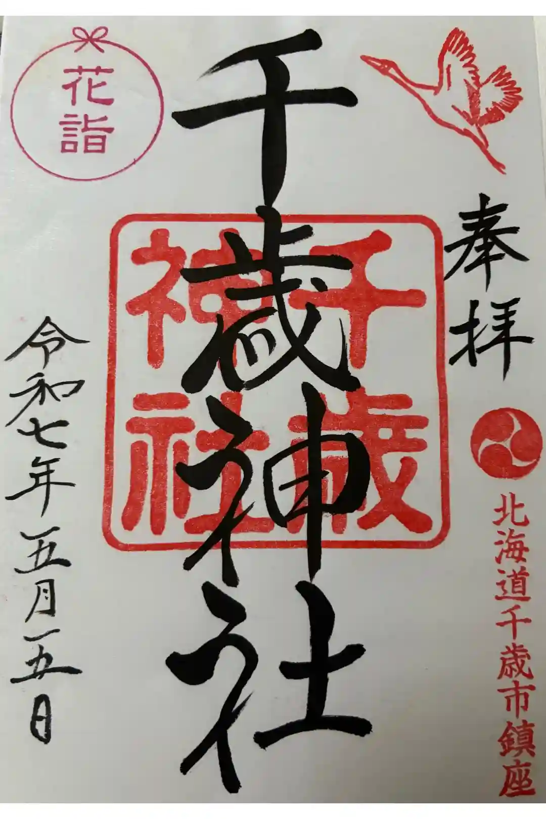 右上にび立つ鶴が描かれた印、右下に三つ巴紋と北海道千歳市鎮座と書かれた印が押されています。