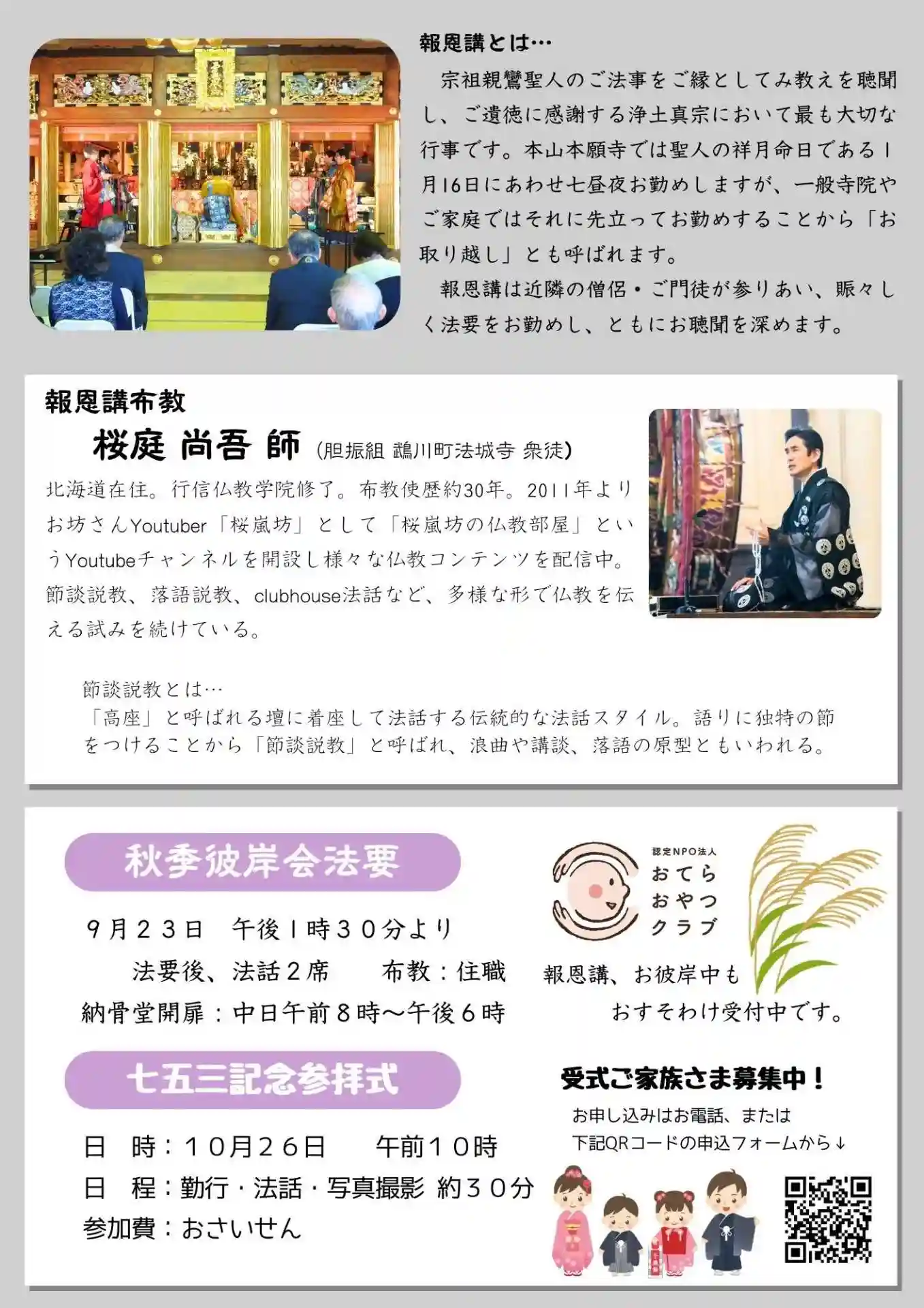 ご講師の桜庭先生はYouTuberとしてもご活躍の方で、今回は節談説教という伝統的な法話スタイルでご法話をいただきます。また8日にはお念珠や小物の販売会もございます📿