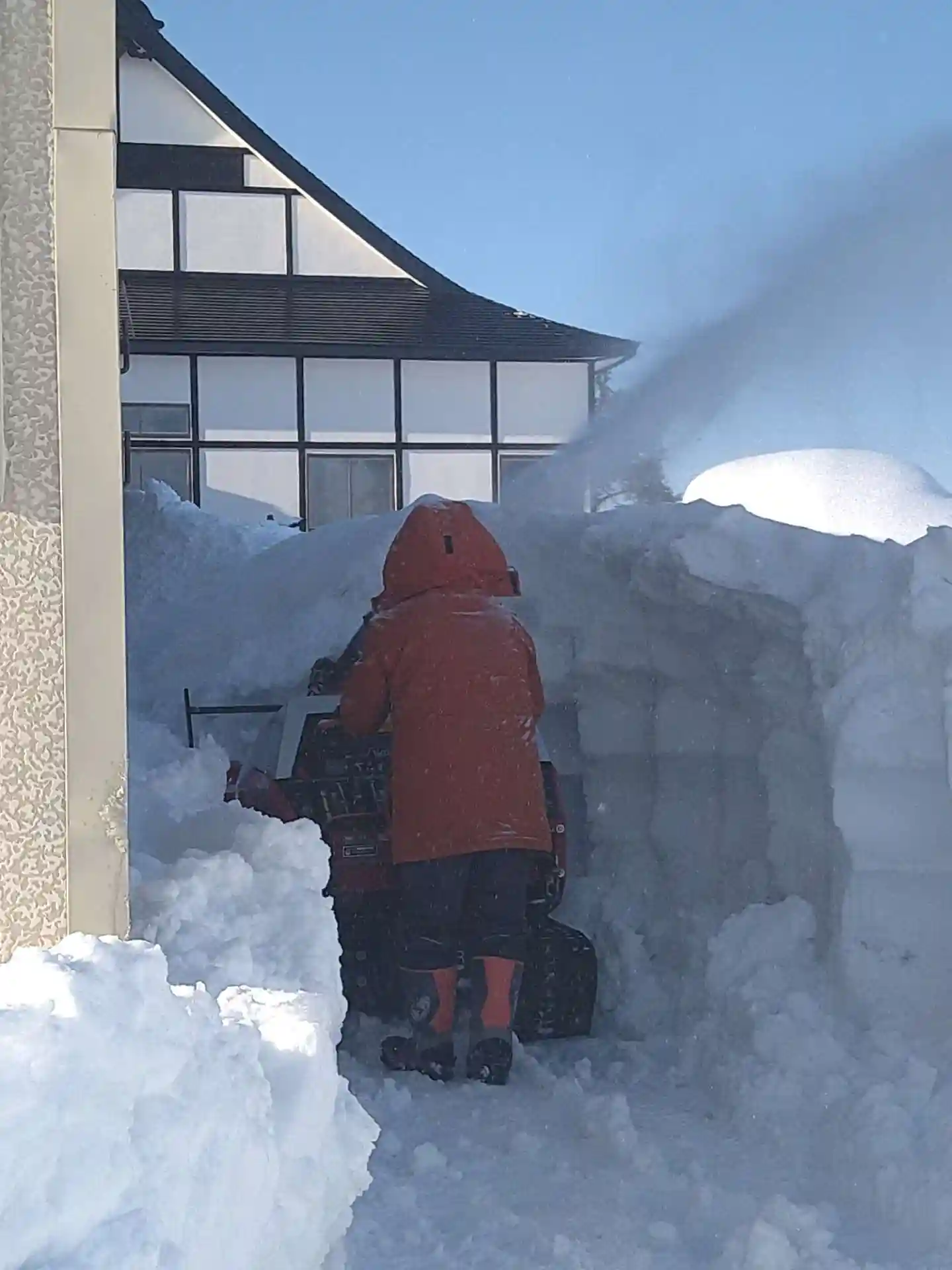 写真2枚目は2階から撮った様子なのですが、除雪が必要なのはこのずーっと奥で、屋根が低いため雪がつっかえる場所があるんです。ちなみに雪に埋もれているのが1階の窓です💦