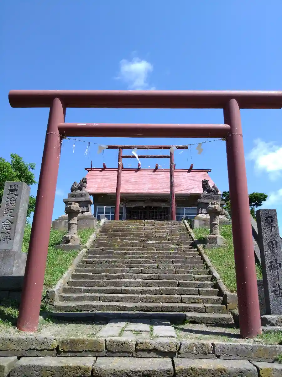 近くには、厚田漁港、市役所、道の駅があります。神社からは厚田の海が見えます。