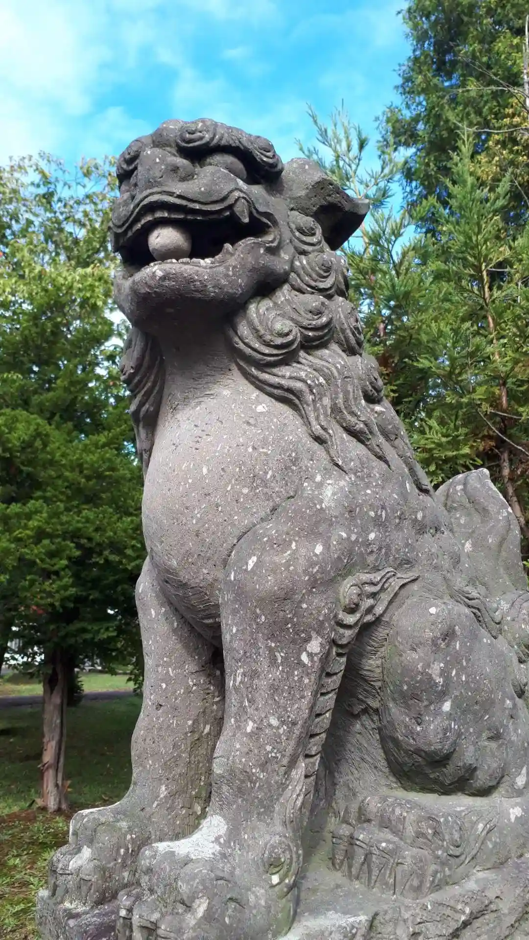参道左側の<狛犬>。北海道でよく見かける黒色の石材。凛々しい風貌。