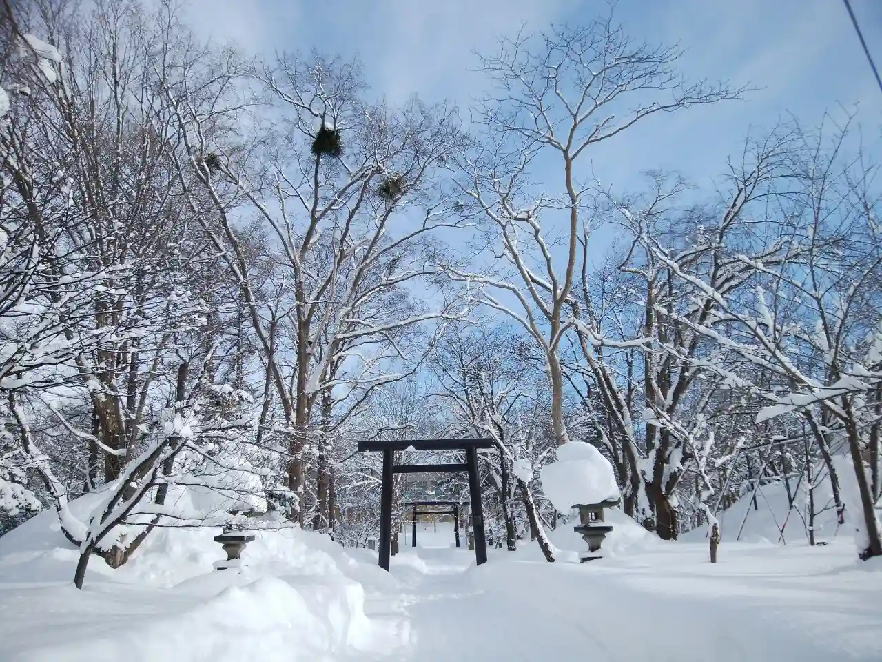真っ白な境内の木々には立派な鳥の巣!緑の季節には気付かない発見も冬の楽しみ🎵
