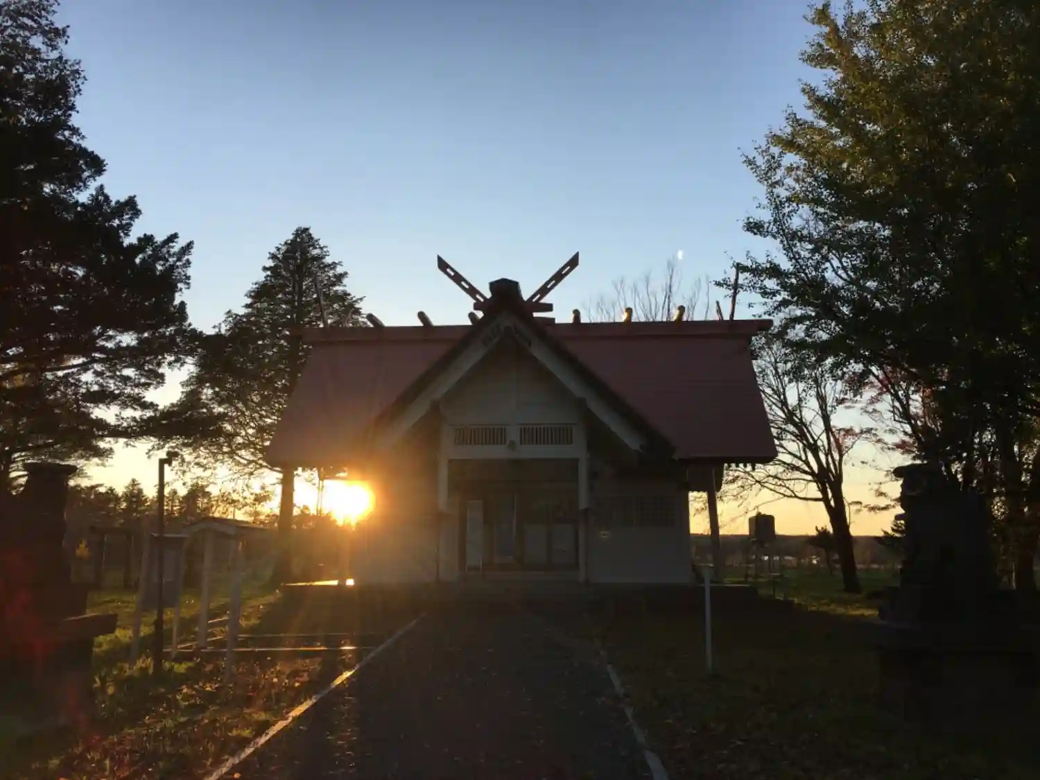 拝殿の右後ろに落ちゆく夕日。