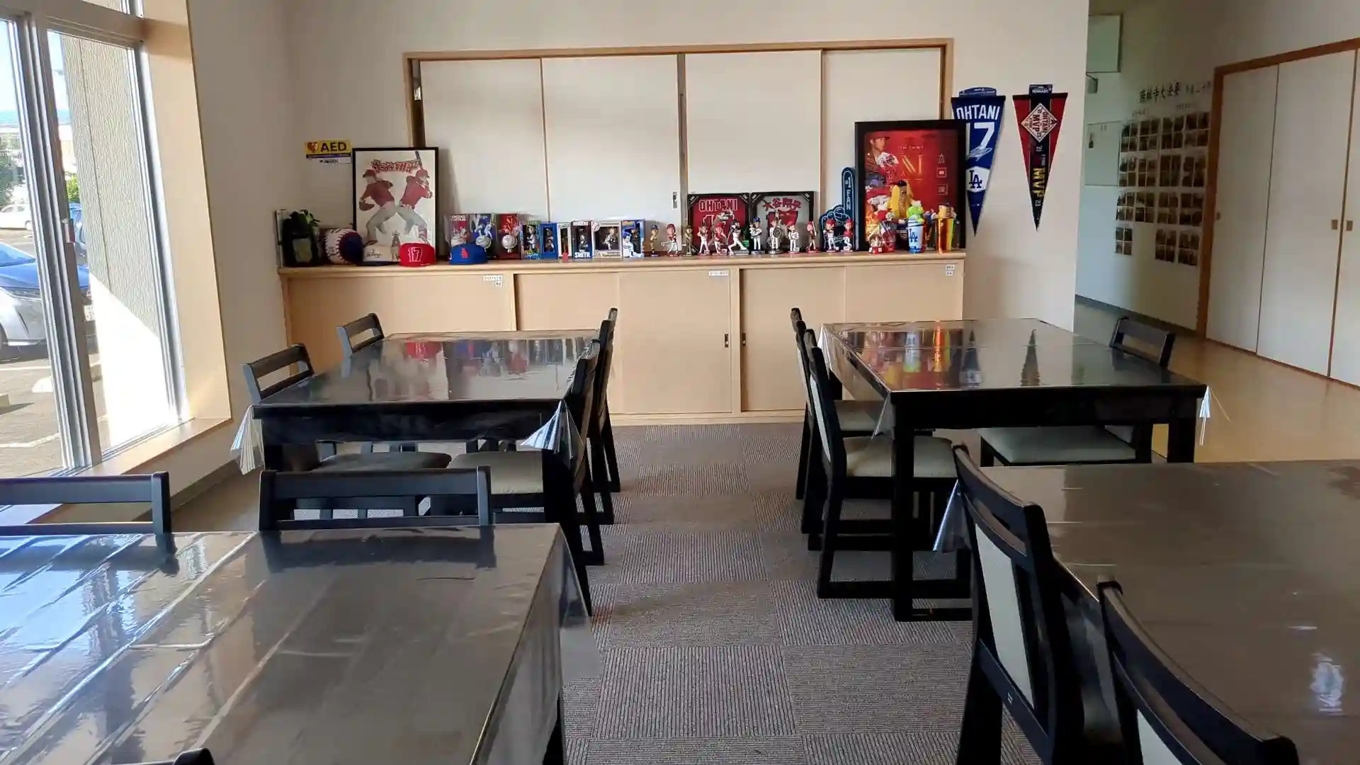 建物が2つあり小さい方が旧本堂で大きい方が納骨堂を備えた今の本堂です。旧本堂隣には地蔵堂があります。寺務所で御朱印帳に書いて頂いている間に御本尊に参拝。新しく建てられたこともあり綺麗な本堂でした。木彫の仏像なども祀られています。寺務所前の休憩スペースにはファイターズグッズがズラリと並んでいます。その隅にAEDが設置されています。