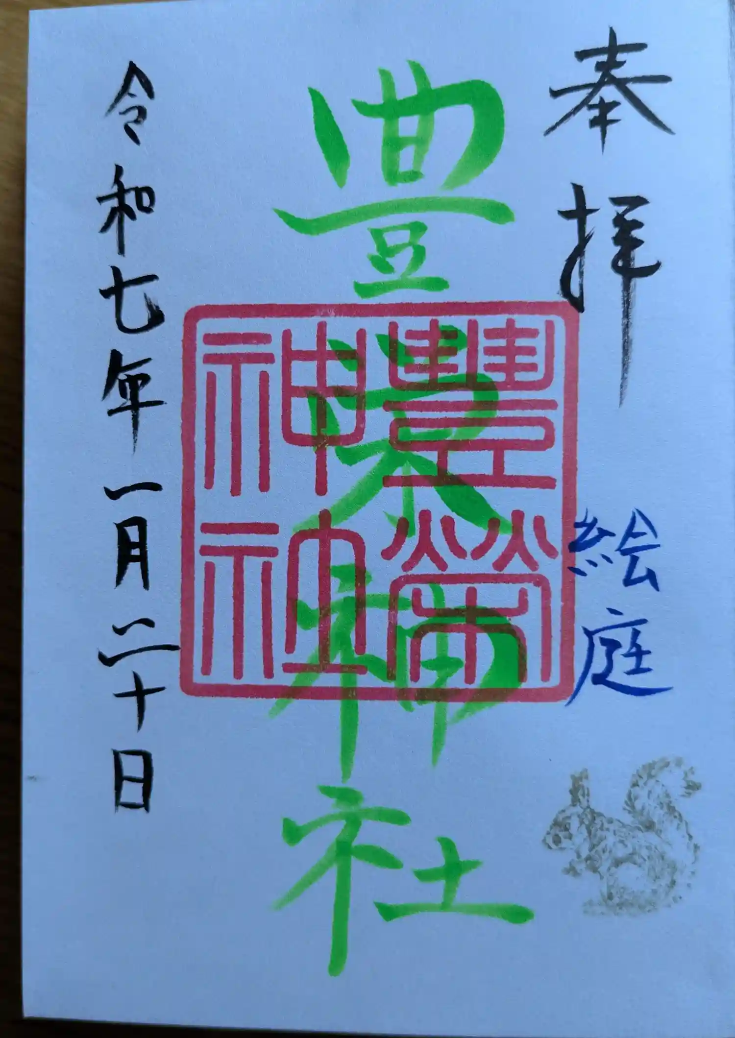 素敵な投稿が続いていた恵庭の『豊栄神社』さん参拝。楽しみにしていた可愛い御朱印を拝領!文字に組み込まれた金色に輝く寅さんがステキです♡
