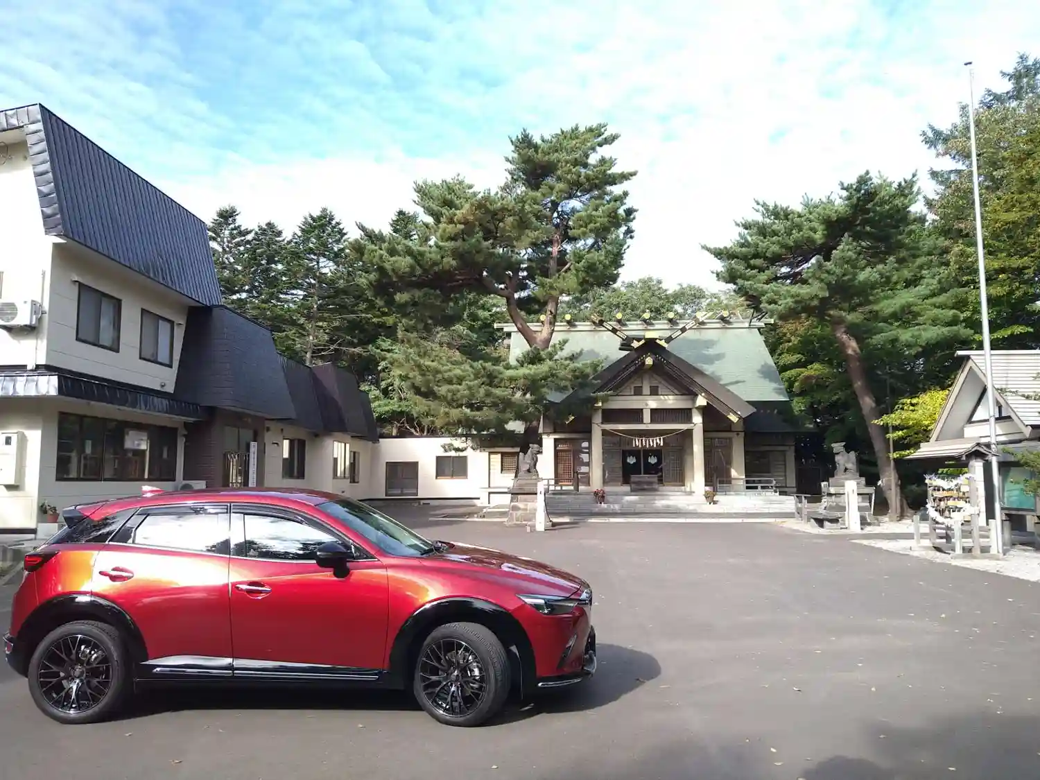 愛車と江別神社さん拝殿、車も喜んでるみたい😄