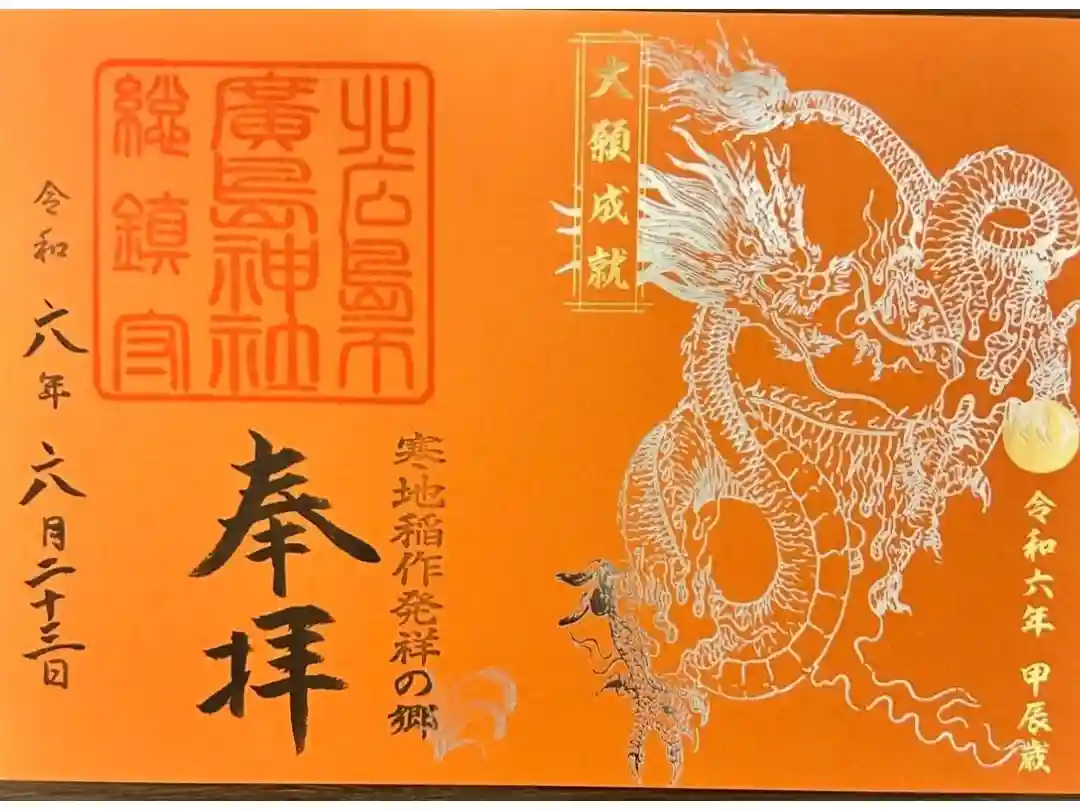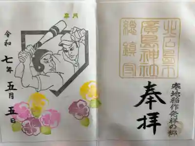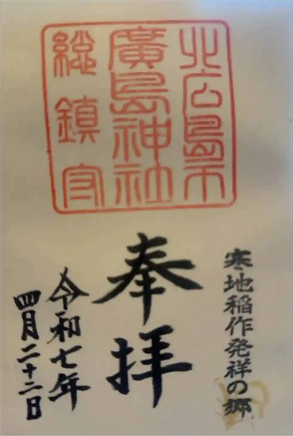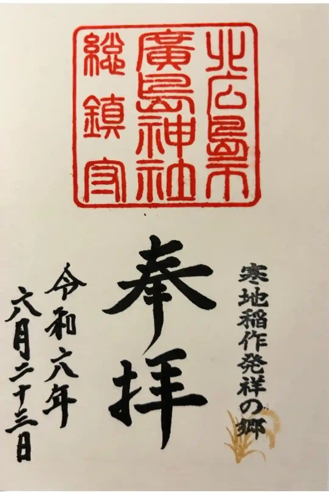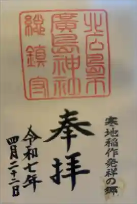 右下に寒地稲作発祥の郷の印が押され、上部に大きく北広島市廣島神社総鎮守の印、その下に奉拝の文字が入っています。