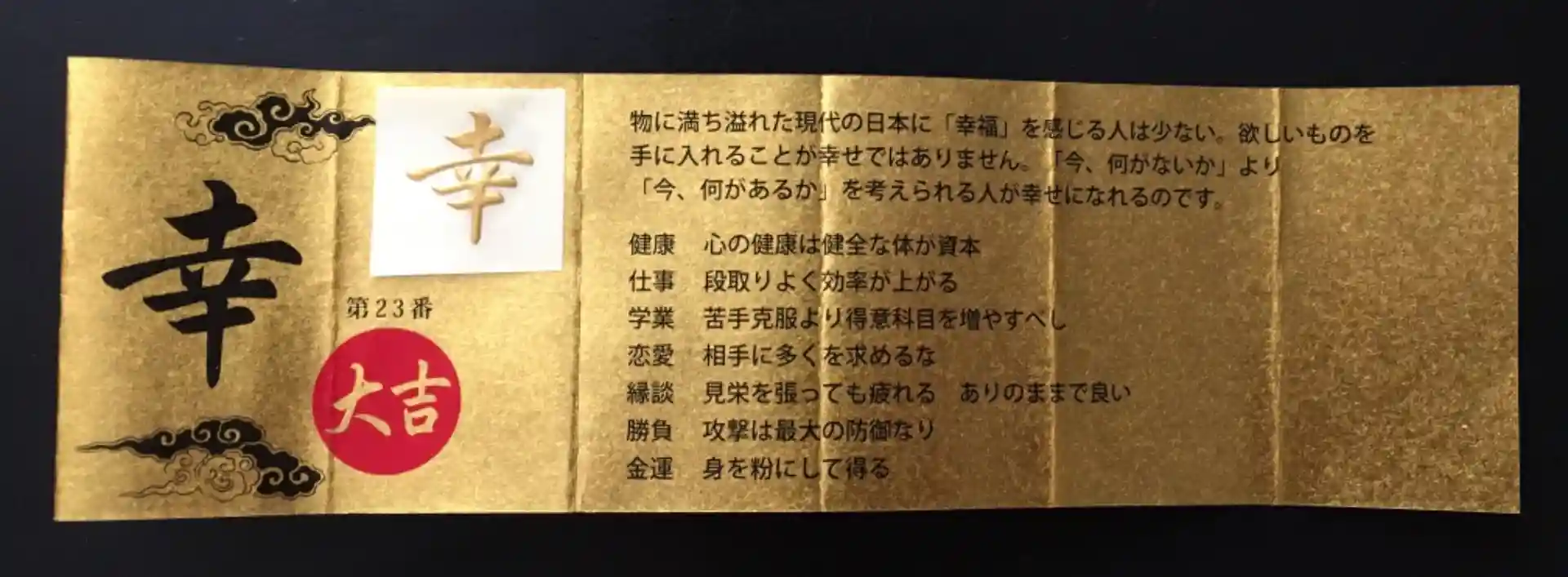 毎年、一年を占う気持ちでひくこちらの御神籤ですが、今年は御神籤が並んでる所に見当たらず、問い合わせようと受付玄関に入ったらありました☺️今年の漢字は「幸」、そして大吉は初めてかも?一粒万倍日にめでたい!ただ、最後の金運のところでかくっとなりましたが。今年もやっぱり身を粉にして働けとのお達し💪