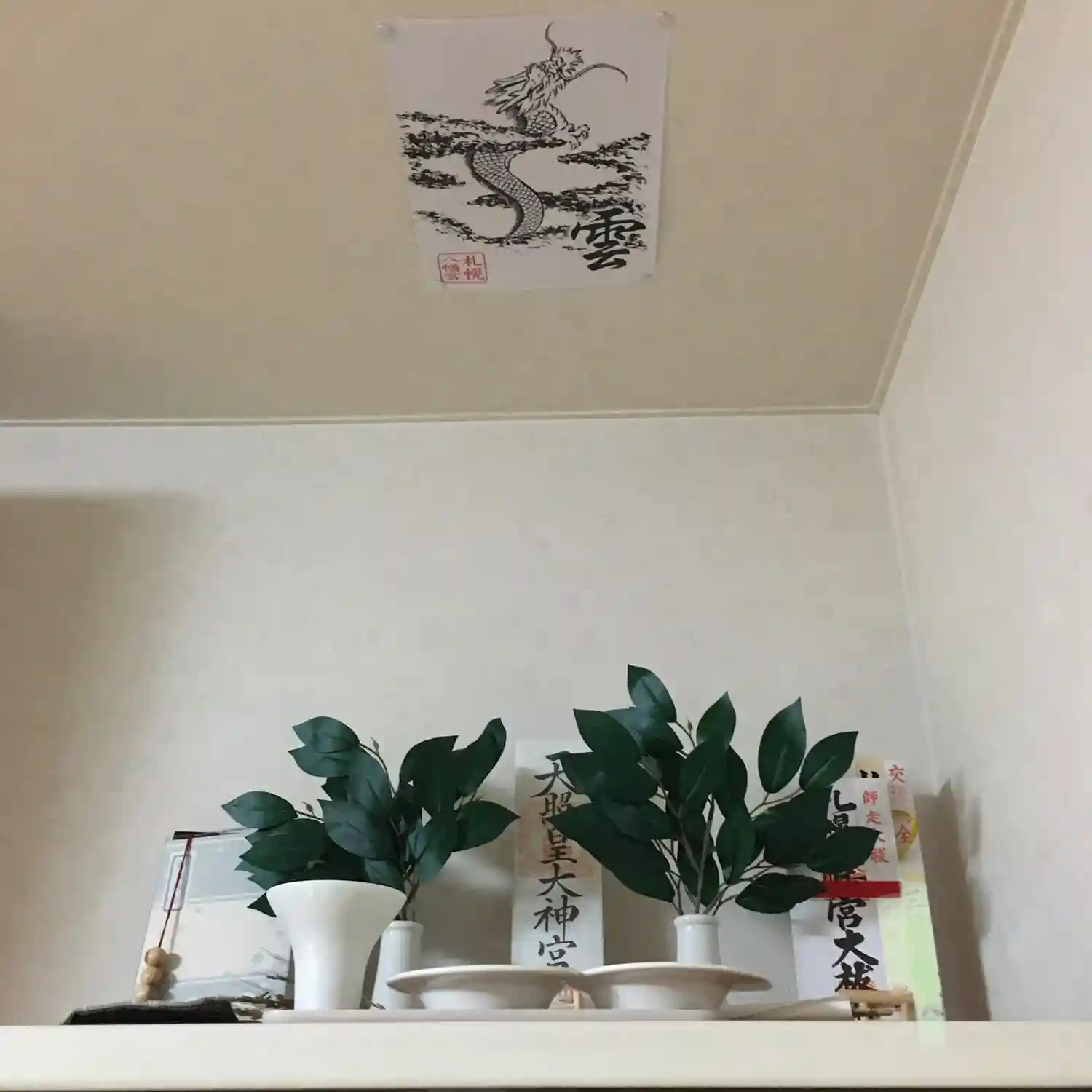 年末に求めた龍の入った雲の字の向きがあやふやだったんですが、今日神社で訊いてきてすっきり。これで神棚も通常モードに戻りました。