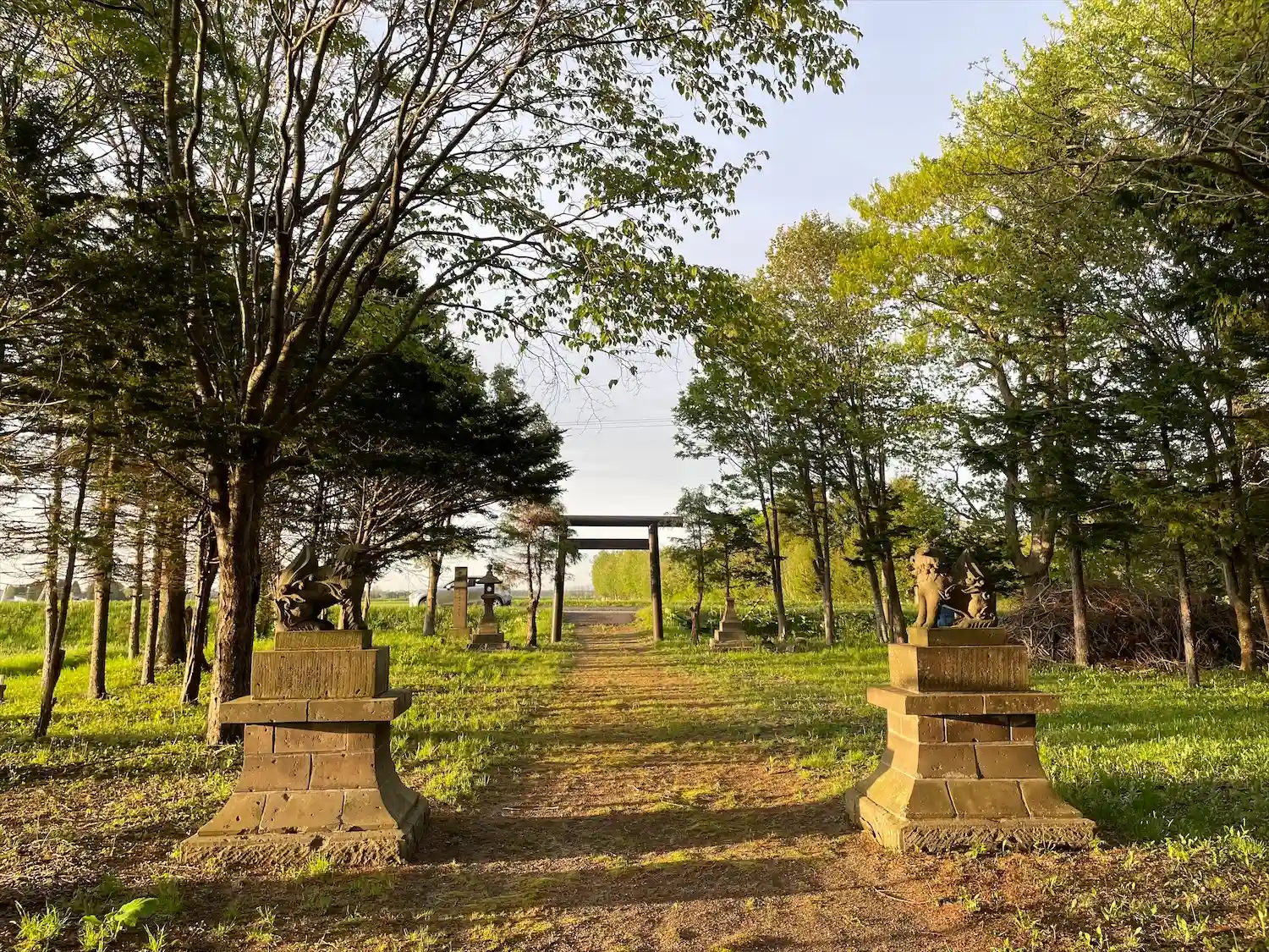 千歳神社を後にしてお煎餅屋さんの工場直売所に寄り道しているうちに、お天気が良くなってきました。千歳神社の飛地境内社へ向かう頃には夕陽が眩しいドライブ。