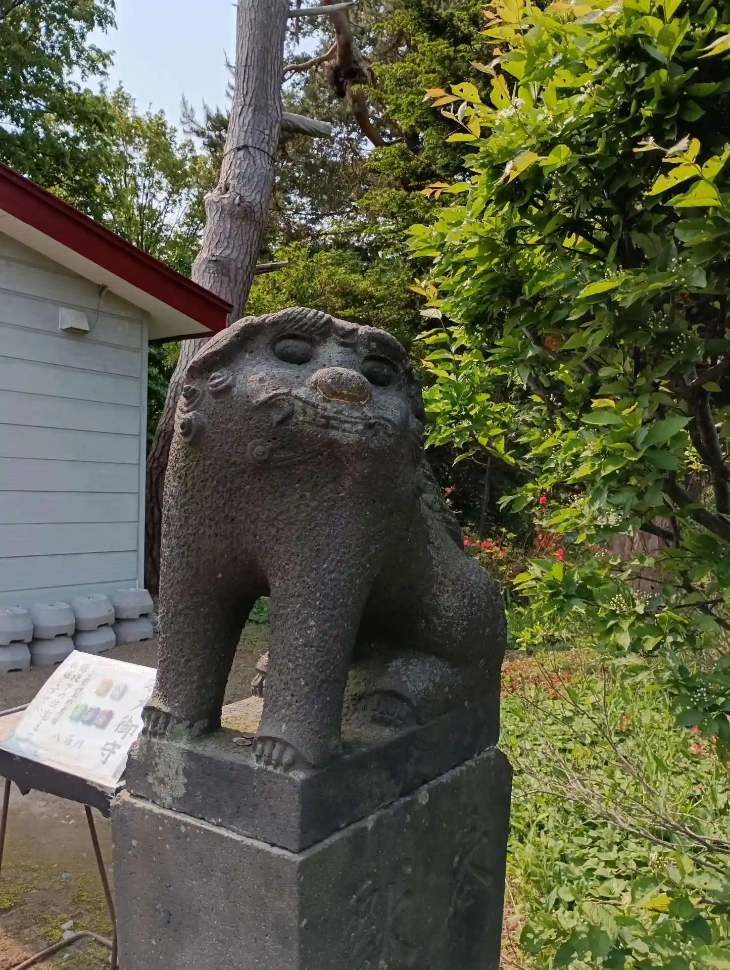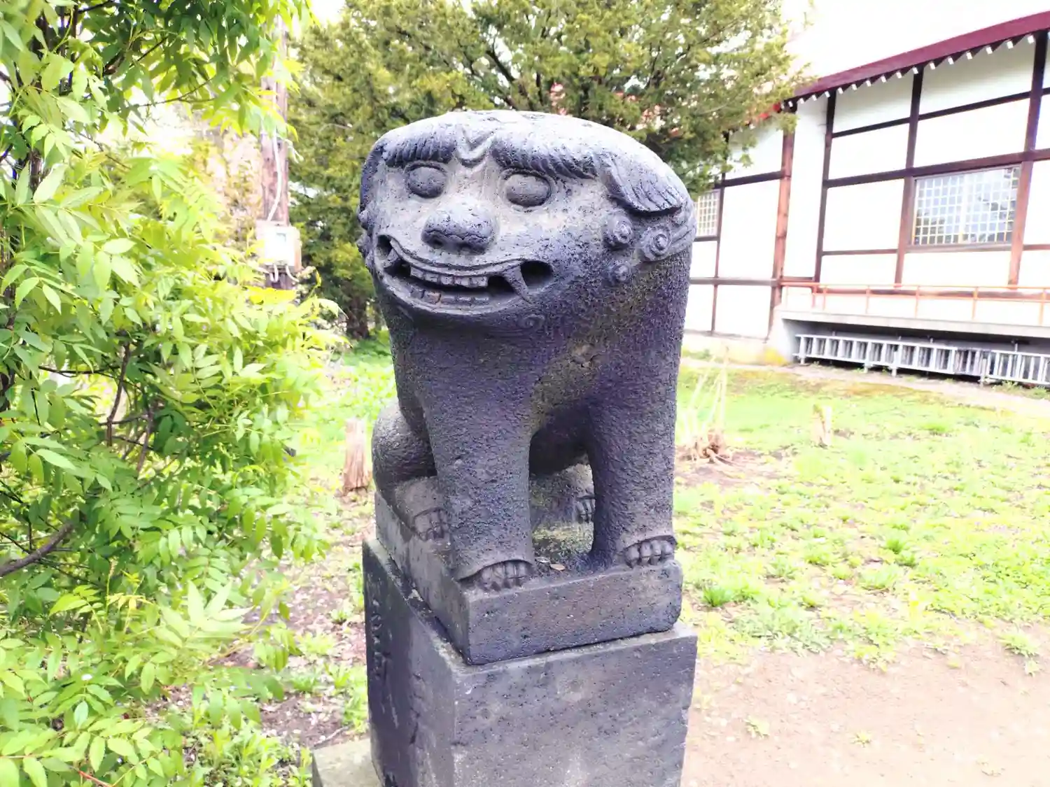 駐車スペースに車を止めて拝殿を見てみると2体の笑う狛犬さんがいらっしゃいます