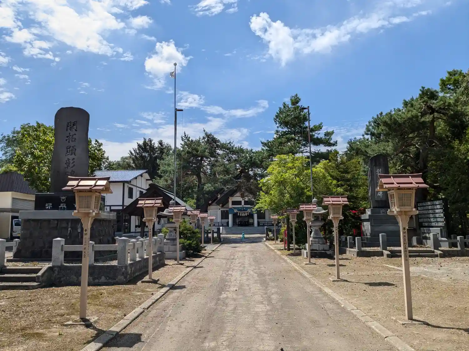 両サイドに慰霊碑や開拓顕彰碑が並ぶ広々と真っ直ぐな参道