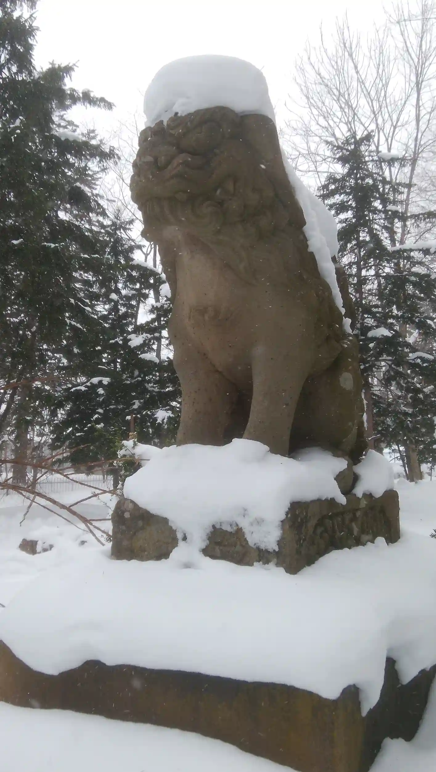 狛犬さん〜吹雪で雪まみれに