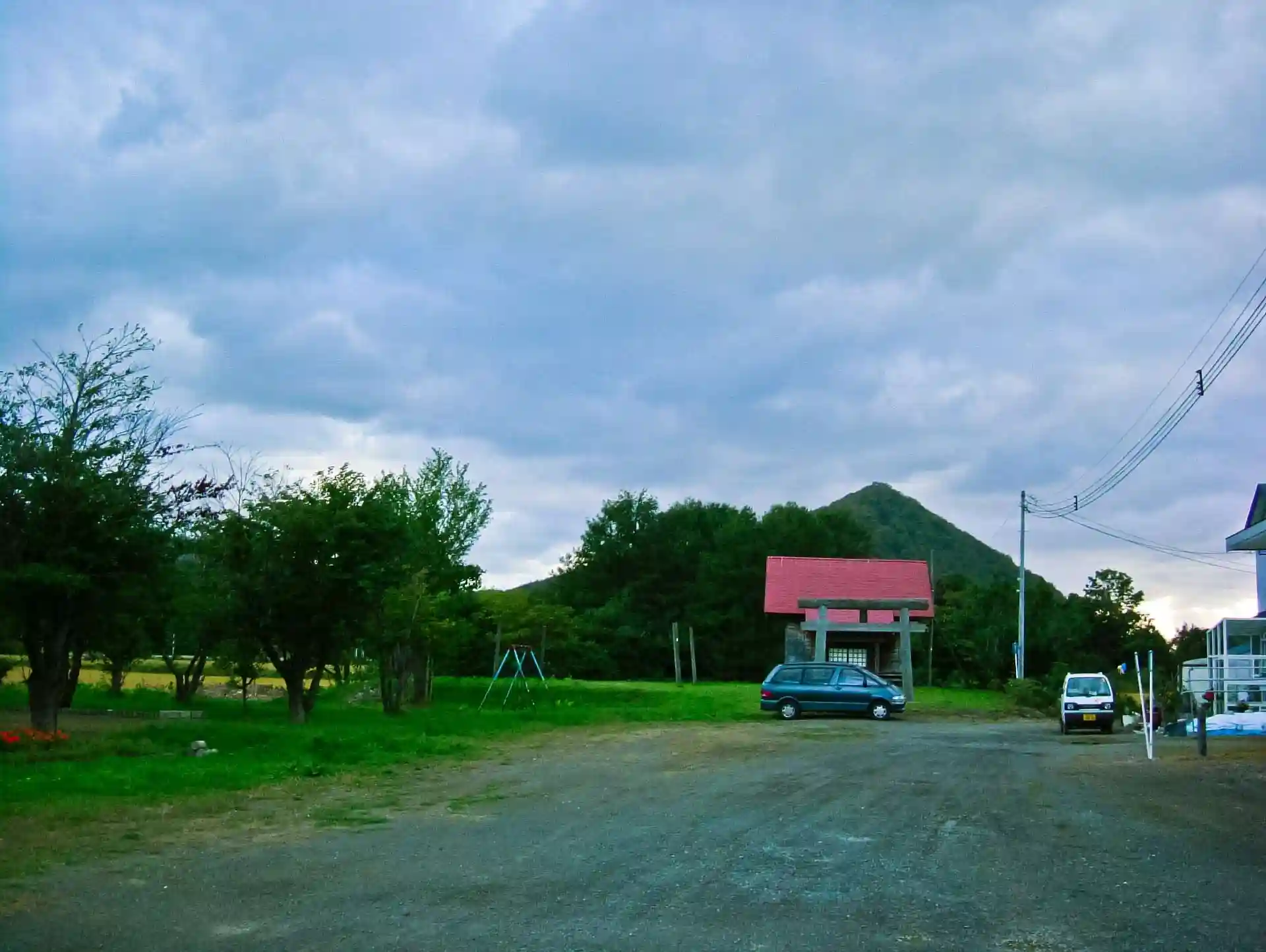開けたところにぽつんと鎮座する。隣の建物は実田会館。公民館だと思います。