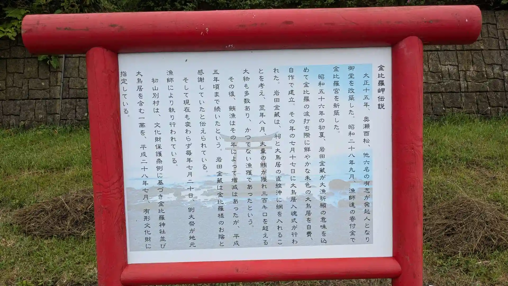 明治の頃に四国の金比羅様の御札が流れ着いているのを見つけた漁夫の奥瀬酉松。御札を海に返しましたが何度流しても同じ場所に戻ってくるため縁を感じて祠を建て御札を祀るようになりました。それから岬の海で遭難する船がなくなったと言われています。