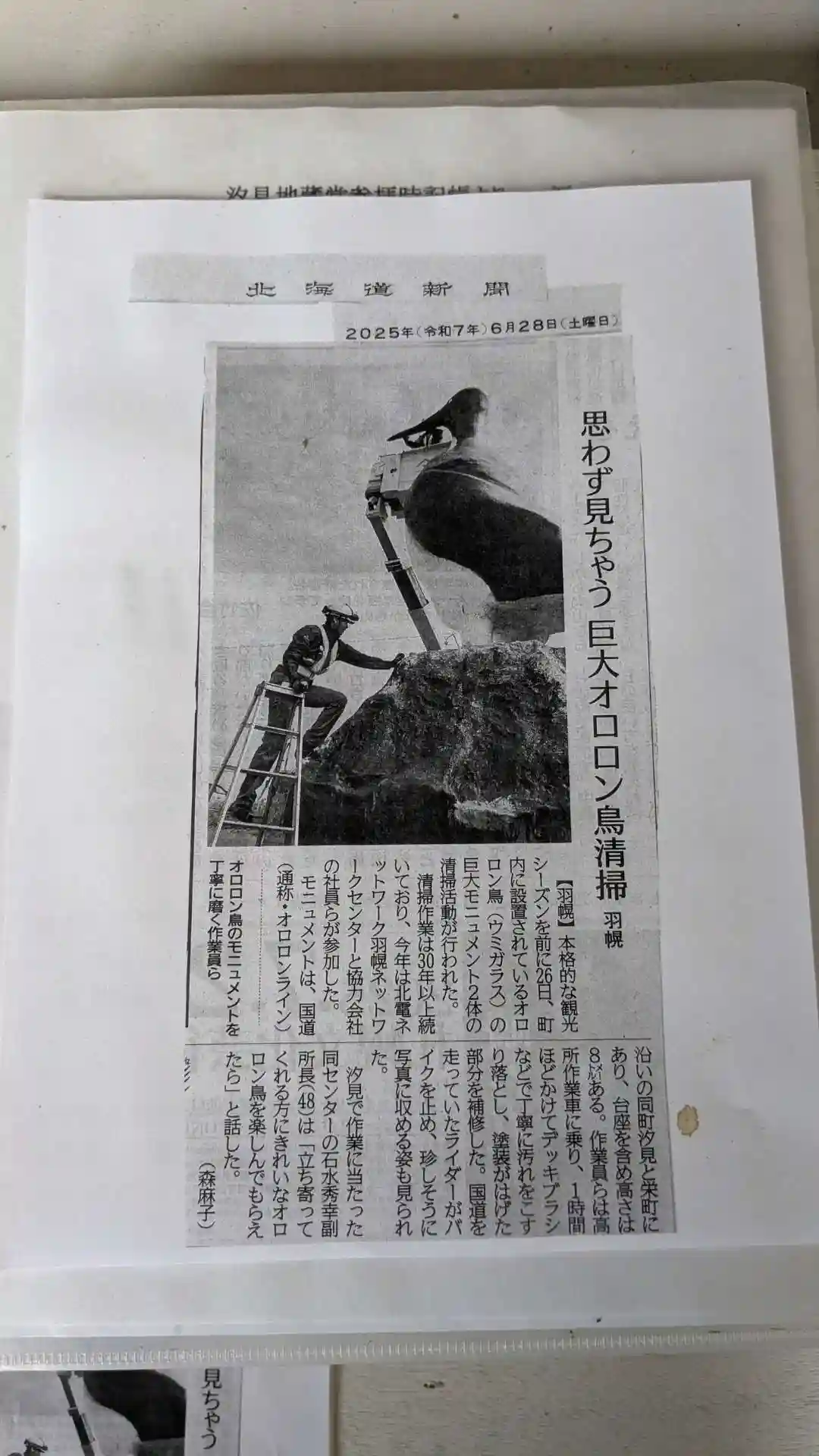 オロロン鳥モニュメントの新聞記事切り抜き