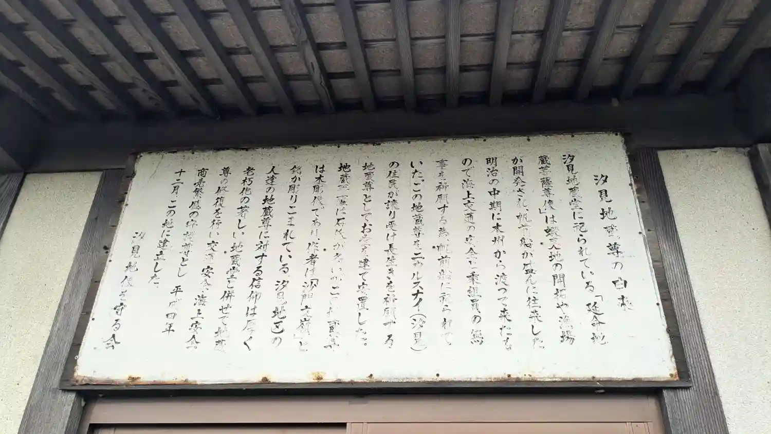 御堂に祀られている延命地蔵様は元々帆前船の往来が盛んだった明治中期に海上安全の為船に乗せられていたお地蔵様でニカルスナイ(現在の汐見)の住民が譲り受け御堂に祀られるようになりました。