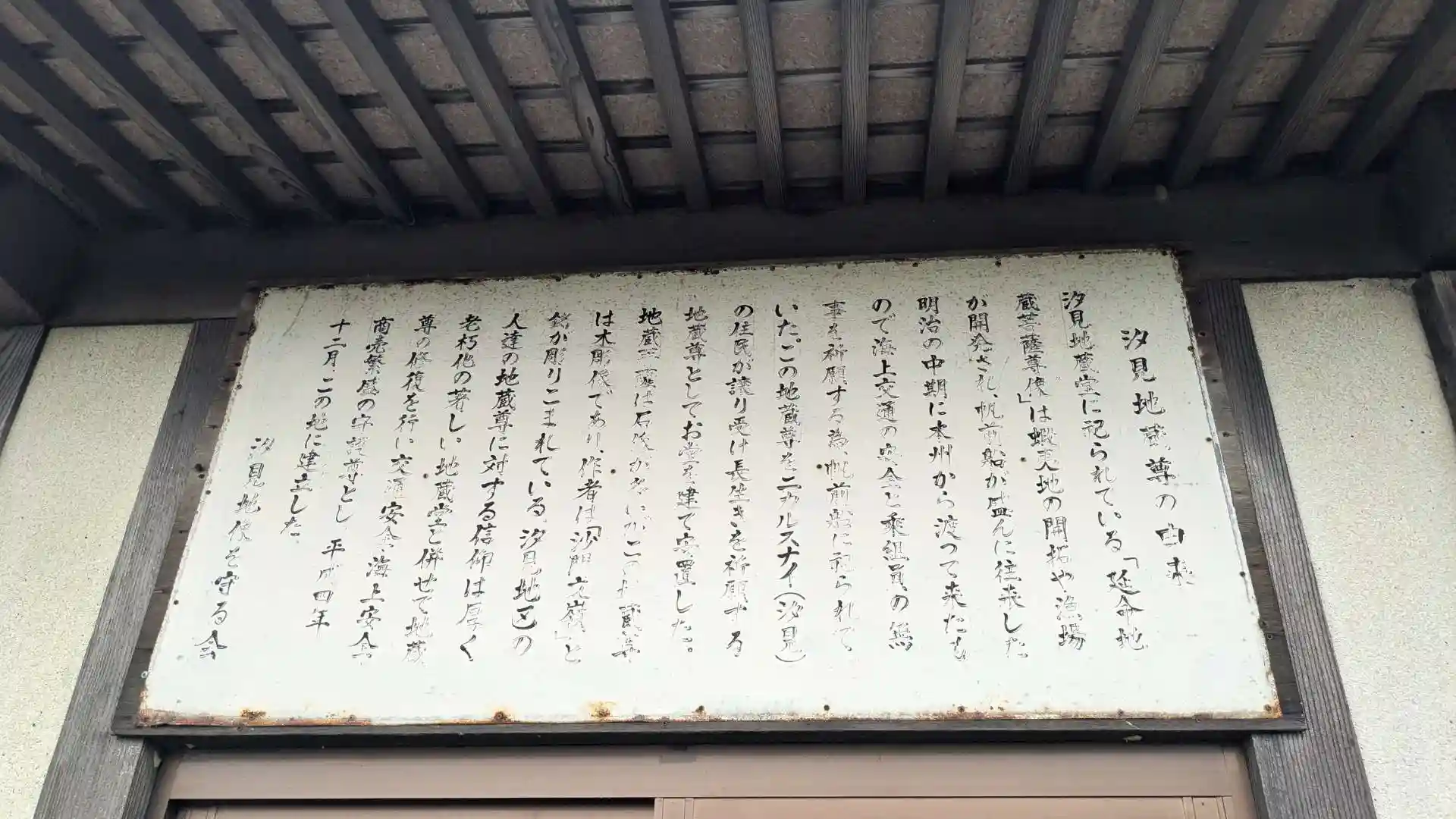 御堂に祀られている延命地蔵様は元々帆前船の往来が盛んだった明治中期に海上安全の為船に乗せられていたお地蔵様でニカルスナイ(現在の汐見)の住民が譲り受け御堂に祀られるようになりました。