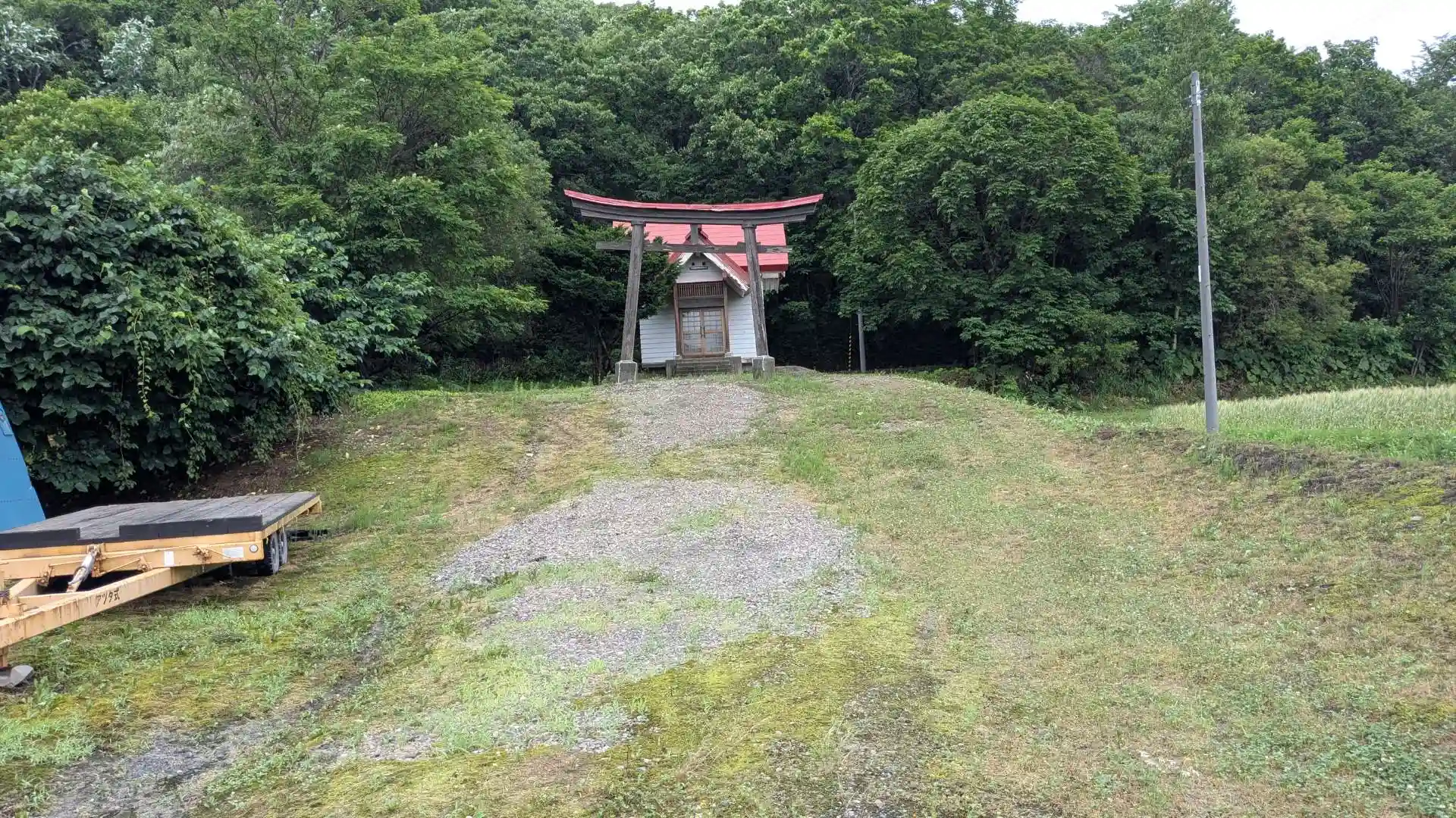 栄地区には同じ名前の神社が2つありこちらは南側。セタキナイ川の近くにあります。小さな神社ですが趣のある明神鳥居が目を引きます。社殿は閉まっていて御賽銭を入れる穴も見当たらずヒグマも出てきそうな場所なのもあり手を合わせてすぐあとにしました。