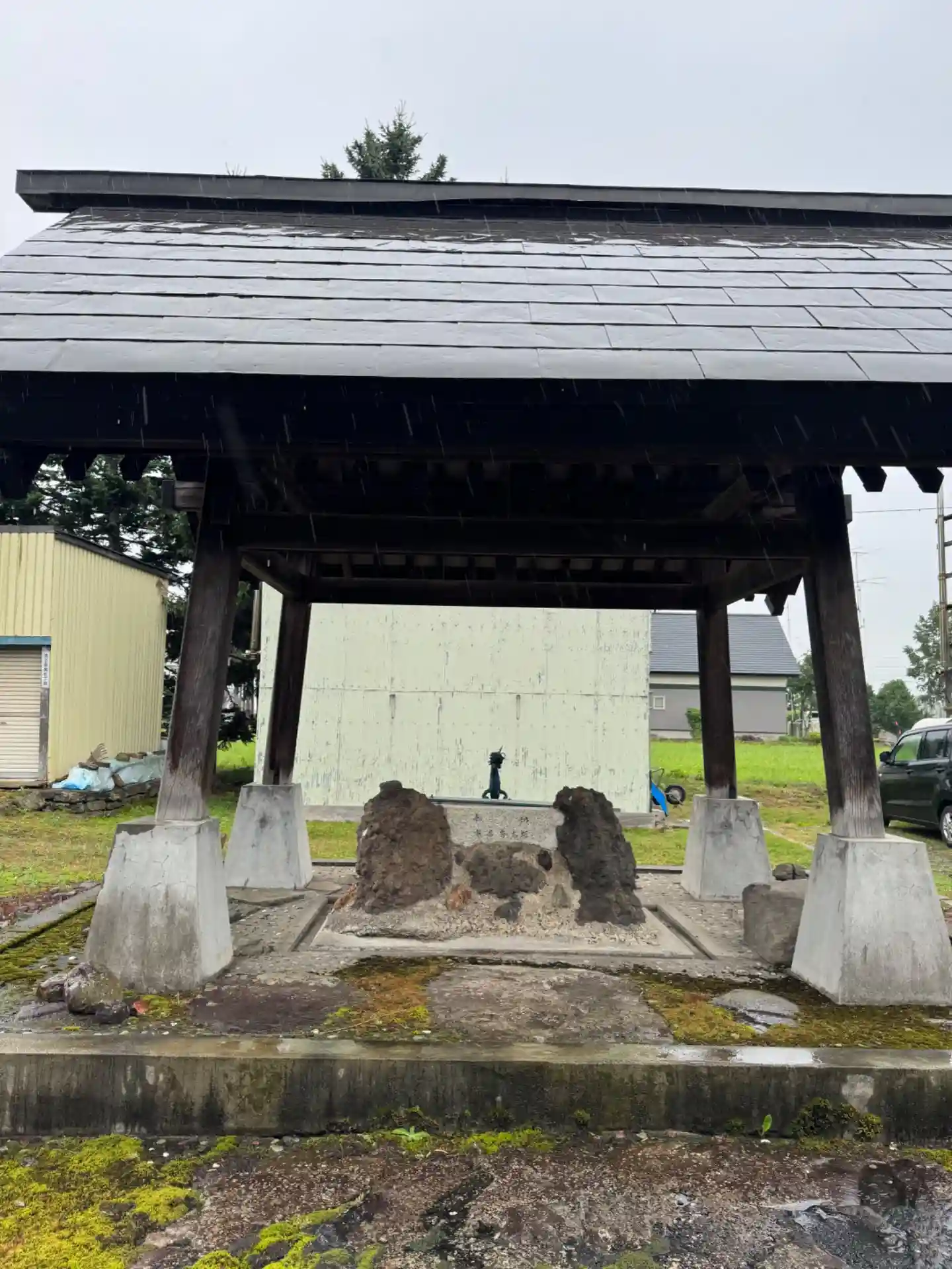 傘をさして国道を歩き、1キロ弱離れた美深神社を目…