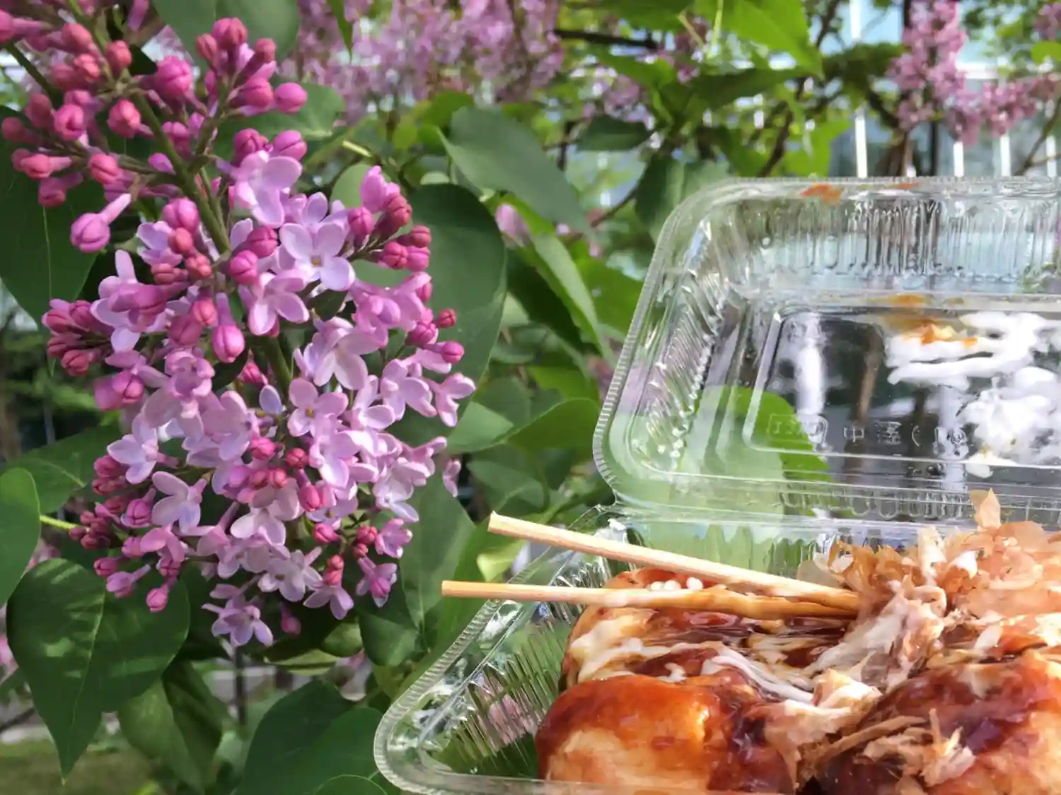 境内では飲食できないので、たこ焼きは熱いうちに近くの大通公園でいただきました。ライラックが見頃になってきています。私は邪魔されずに食べられたのですが、烏に追い回された挙句持ってたフランクフルトを放り出して逃げている人もいました。常習犯と思われますのでご注意を。