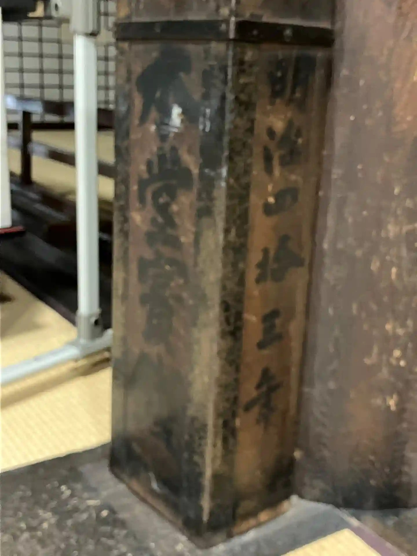 内陣手前の柱脇に、明治43年本堂賽銭とあります。