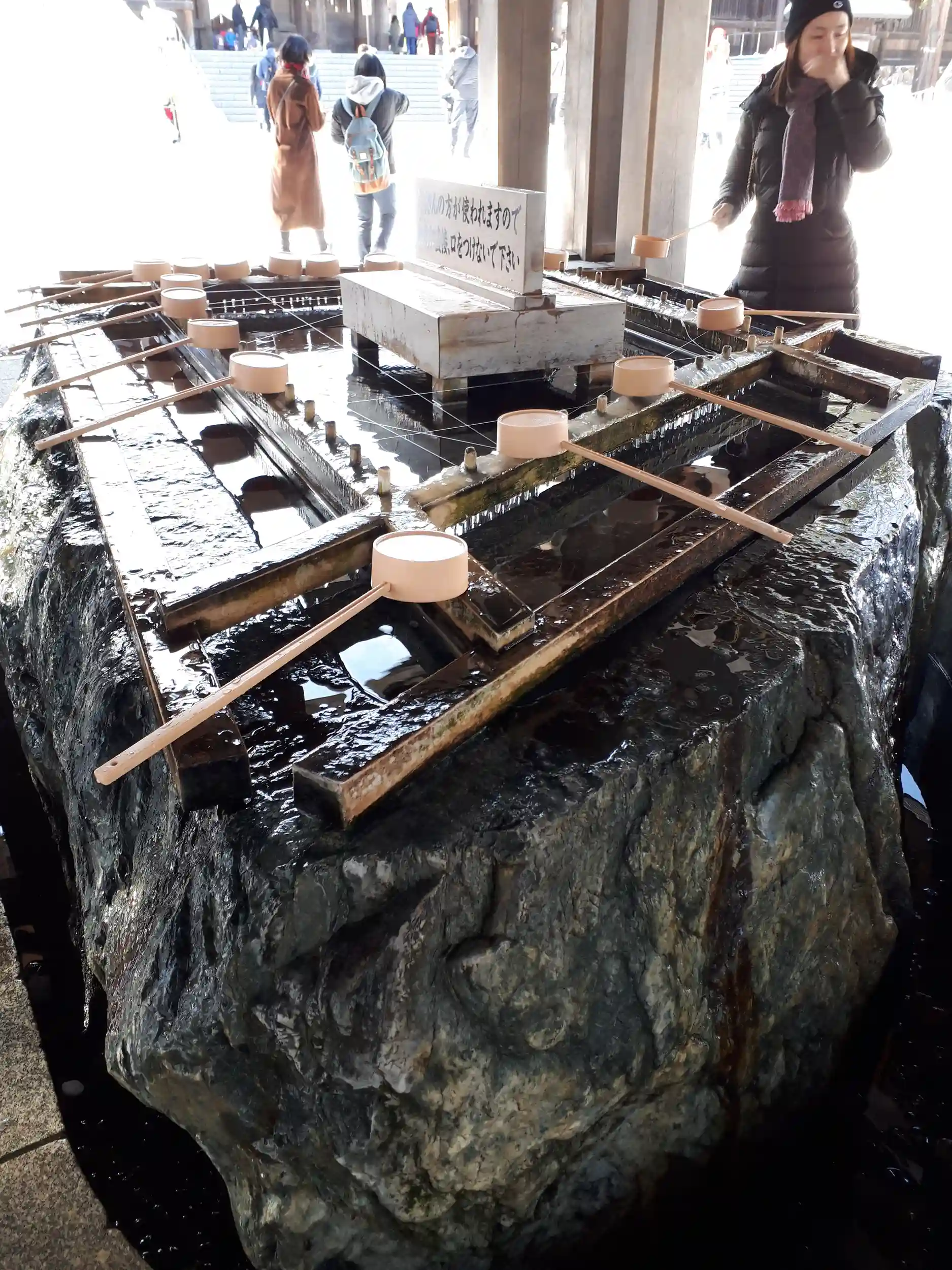 手水鉢。よく見ると、巨大な石をくりぬいてるんだ➰と感心しながらパシャ😵💦