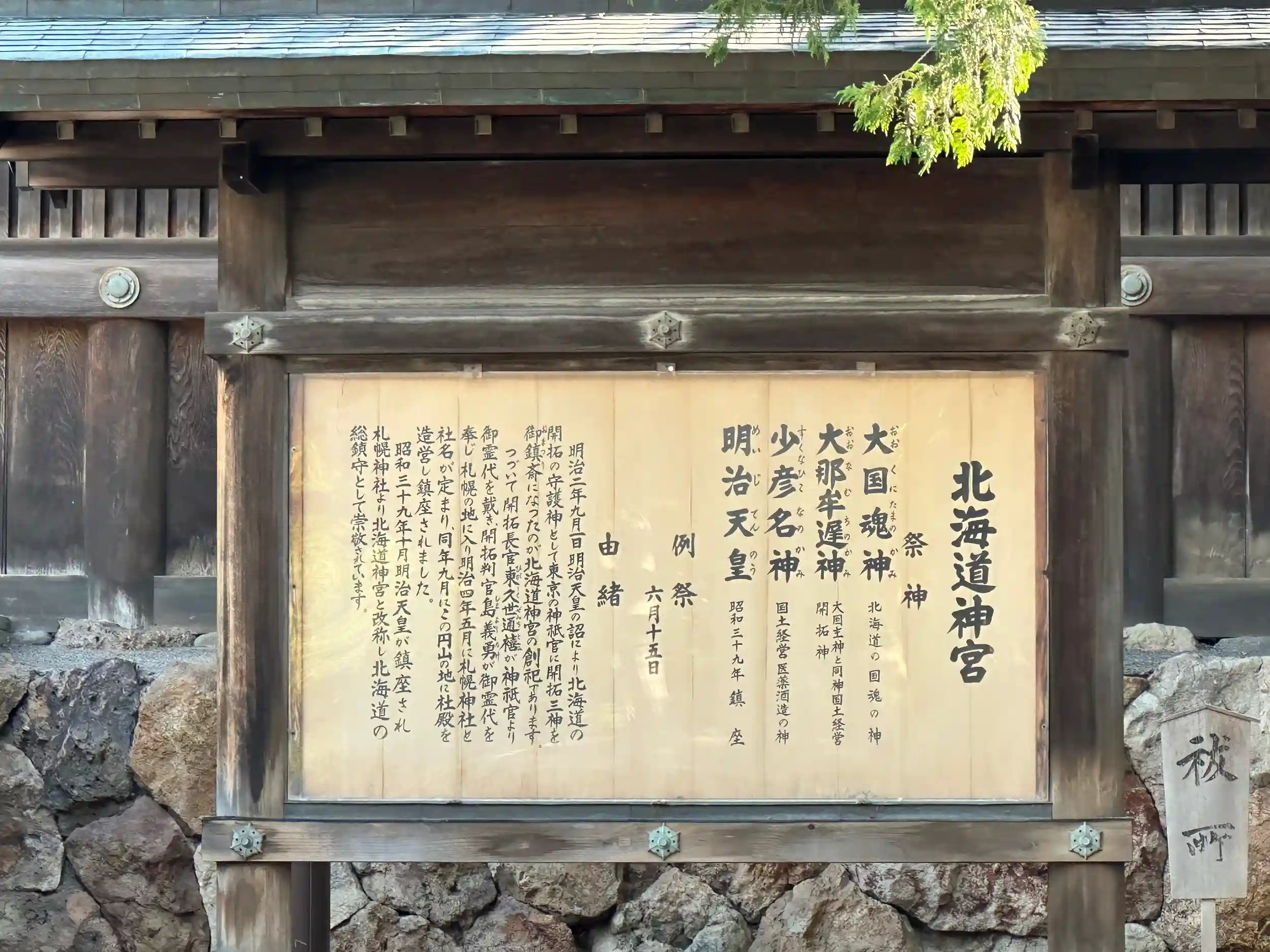 明治2年、当時「蝦夷地」等と呼ばれていた北海道は、日本の国土としてより明確にする為に、「北海道」と名づけられました。そして同じ年の9月1日に、明治天皇の詔(みことのり)(天皇のおことば)により、東京で「北海道鎮座神祭(ほっかいどうちんざしんさい)」を斎行(お祭を行う事)して、北海道の開拓・発展の守護神として、大国魂神・大那牟遅神・少彦名神の三柱の神々(開拓三神(かいたくさんじん)といいます)が鎮斎(ちんさい)されました。