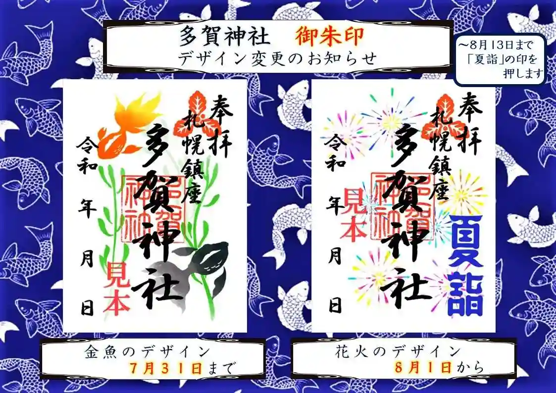 また、8月1日より夏詣と多賀神社例大祭の限定御朱印も頒布する予定なので、こちらもご希望の方は、ぜひともお求めくださいませ。