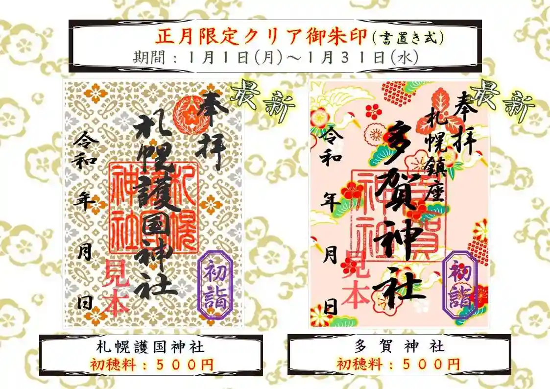札幌護国神社と多賀神社の2種類で、どちらも今回初めて頒布する新しいデザインの御朱印となります。