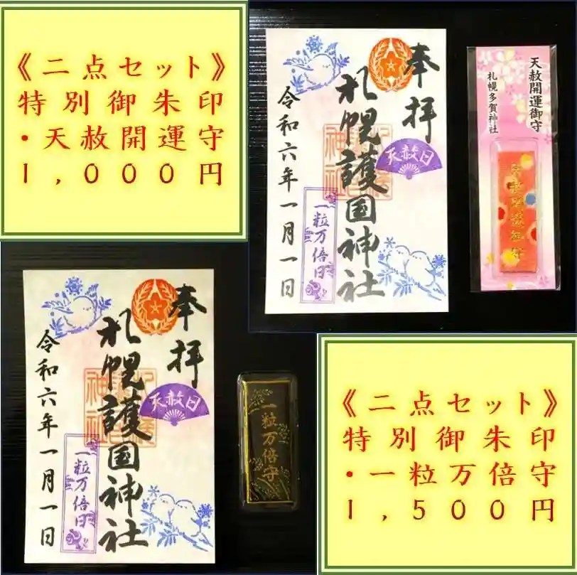 特別御朱印と一粒万倍守の二点セット、もしくは特別御朱印と天赦開運御守の二点セットで、それぞれ1,000円の初穂料となります。