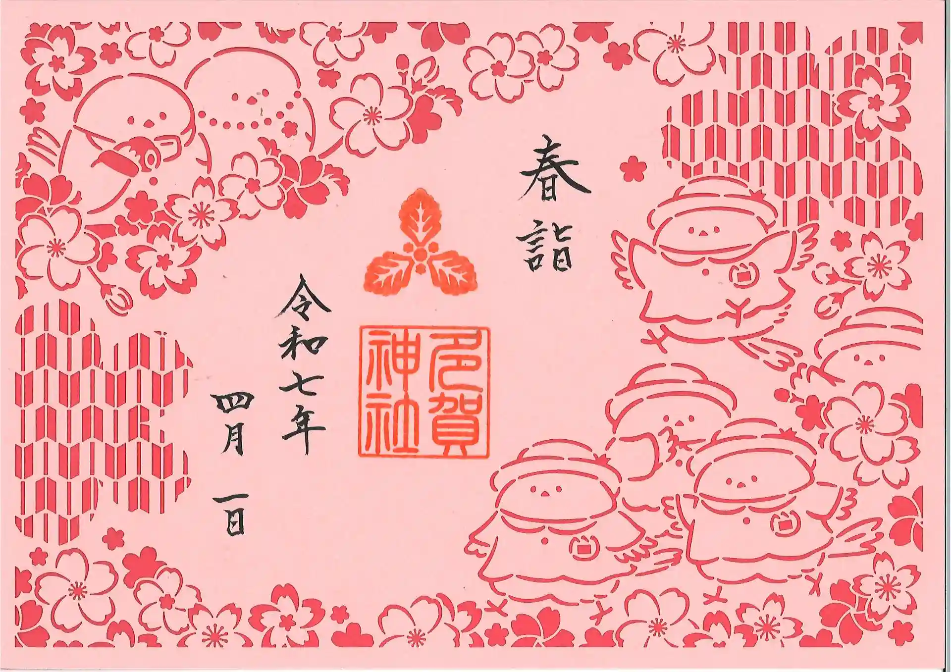 多賀神社の切り絵御朱印は「シマエナガの新入園」のデザインとなります。