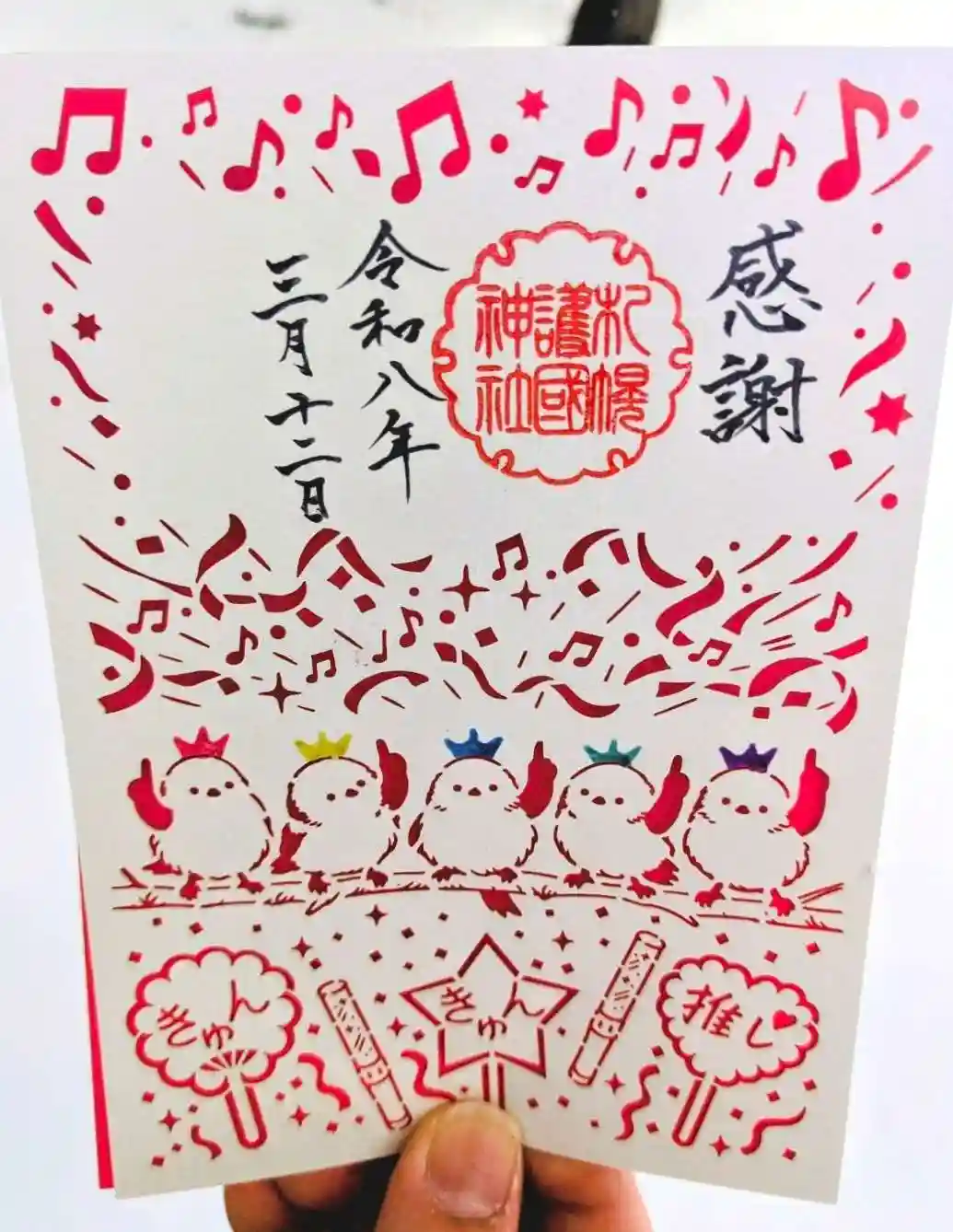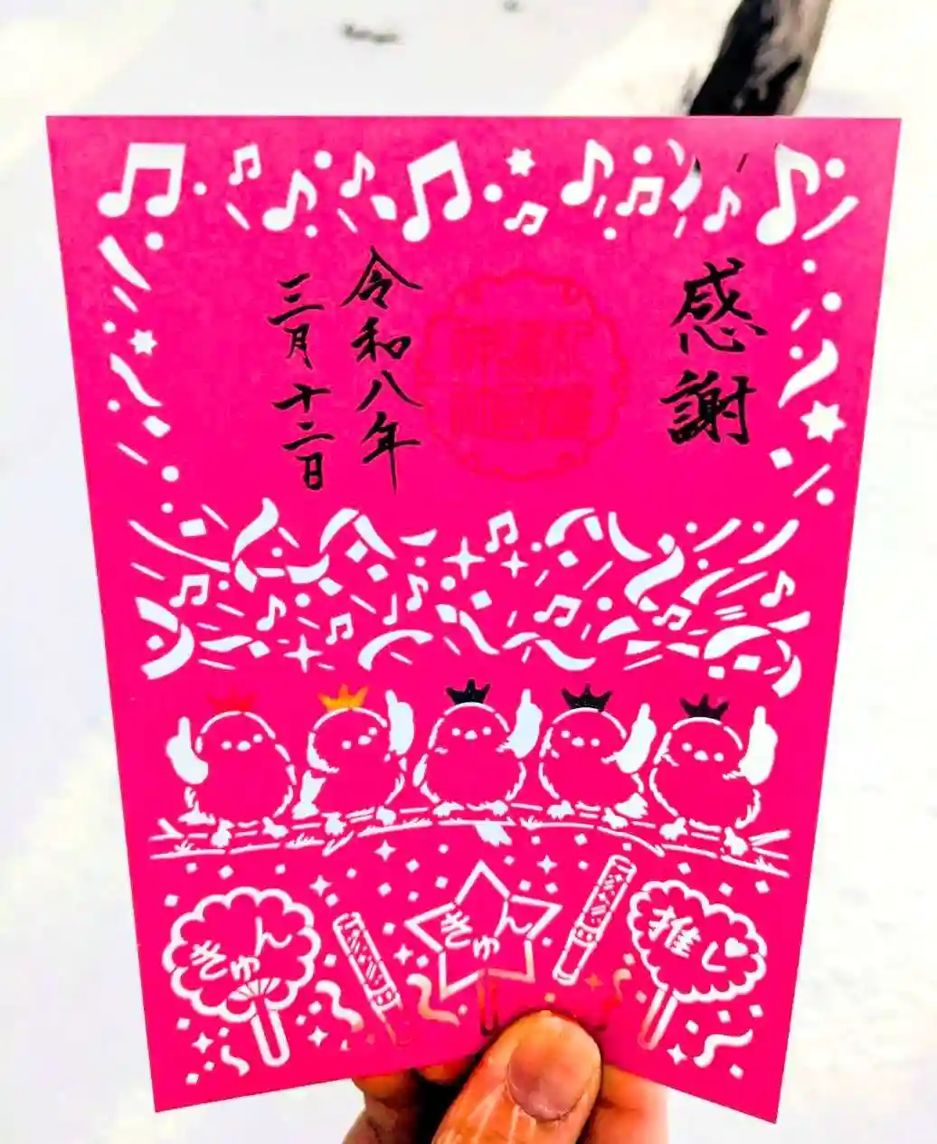 こんばんは。嵐のメンバーカラー❤️💛💚💙💜ですね。13日からラストツアーが札幌から始まるのに合わせていただいたのでしょうか。シマエナガ も5匹、応援うちわもあって素敵です。13日にライブ参戦します。会場に向かう前に参拝予定だったので嬉しいです。無事に拝受できますように‥。