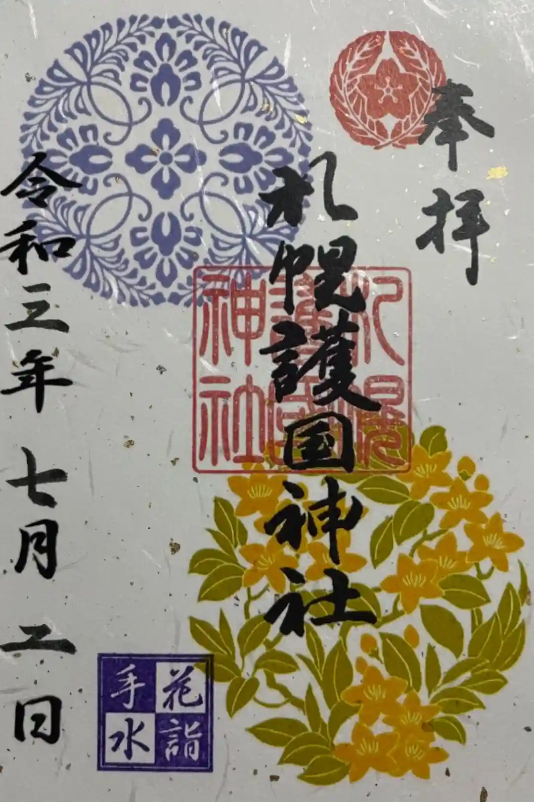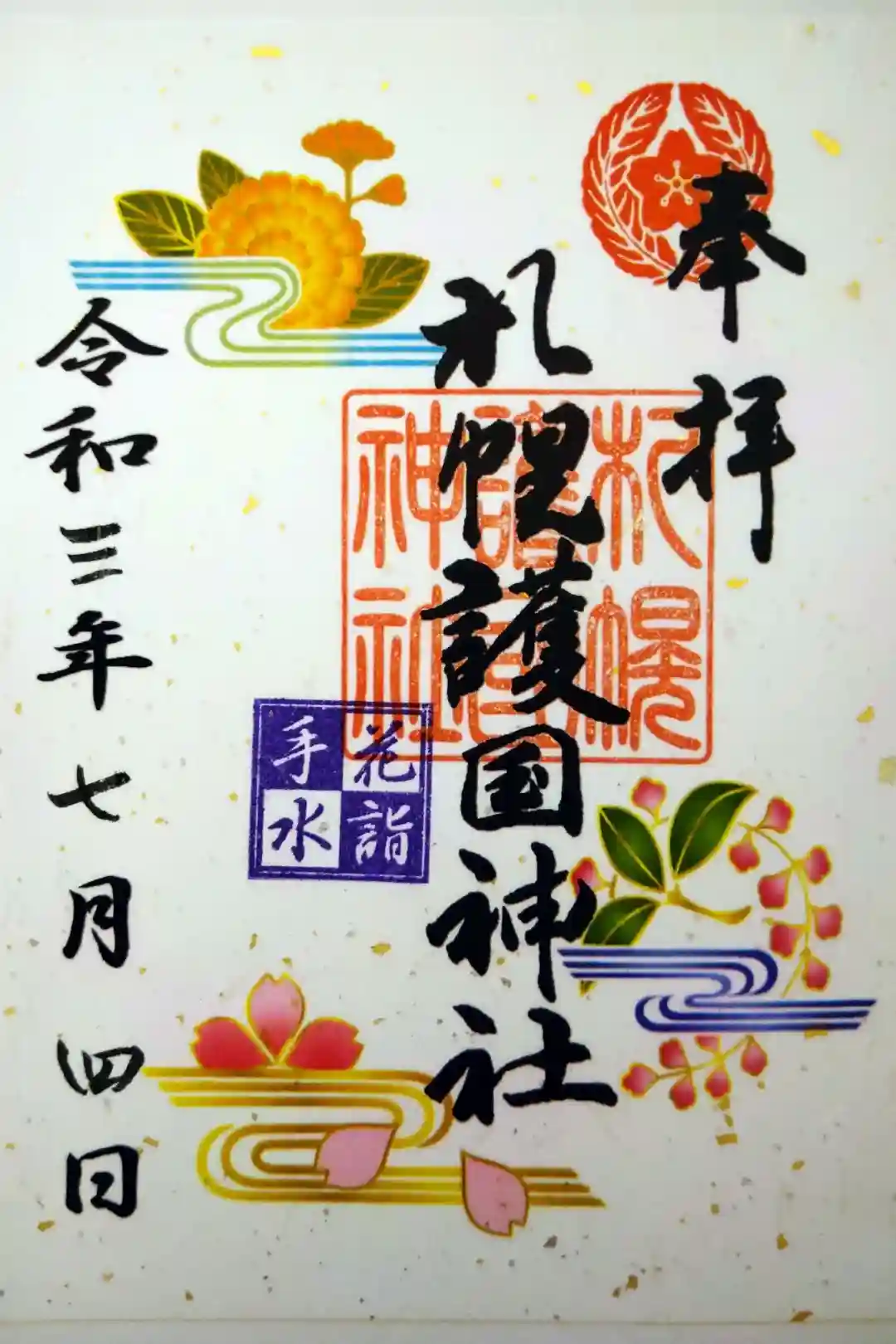 護国神社の社務所でいただきました。同じ花手水限定御朱印と迷いましたが、可愛いりすから目が離せずにこちらに決めました❗️