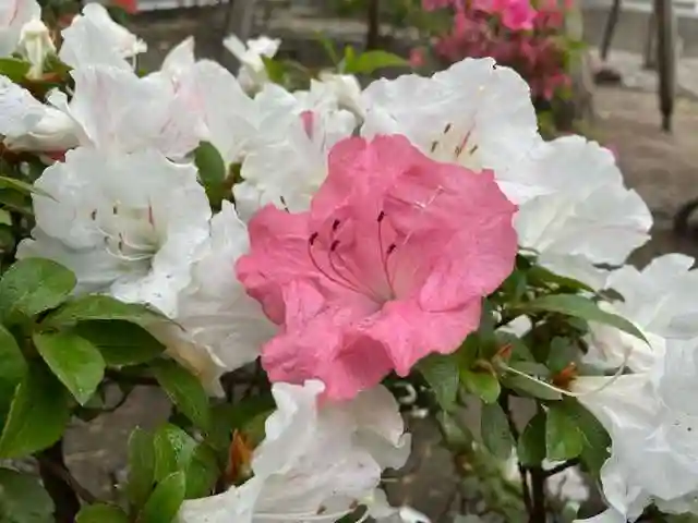 遅い時期に花をつける、旧花手水付近の白いツツジ。