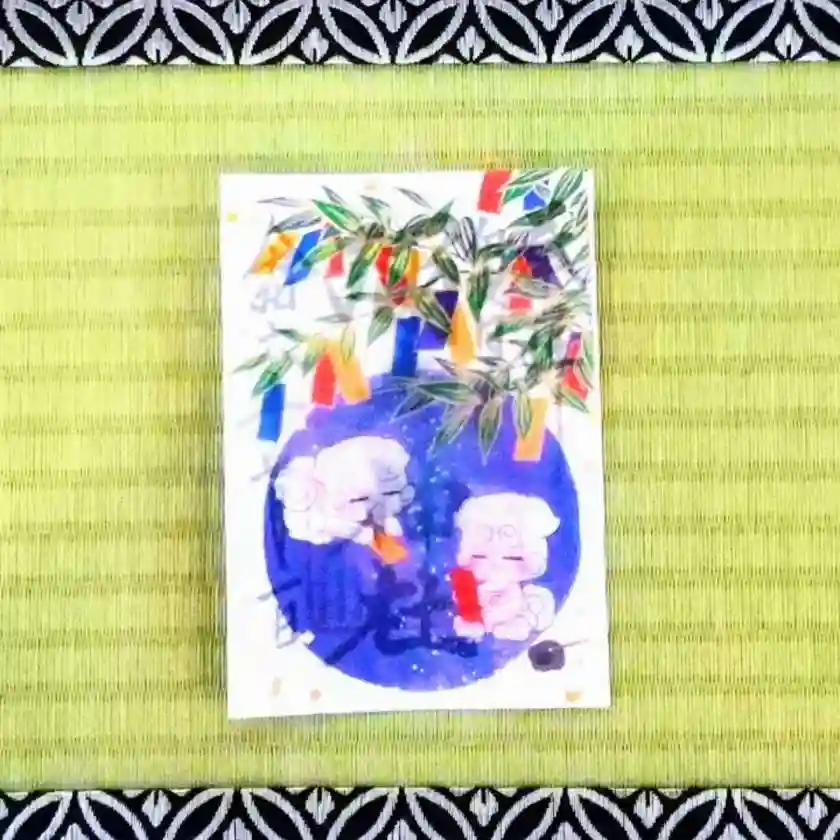 1つ目の『天の川の五色の願い』は願いを込めた五色「赤・黒(紫)・青・白・黄」の短冊が、魔除けの笹に導かれて天に向かっていく様子を描いたデザインです。
