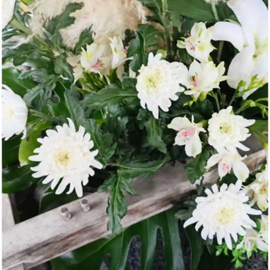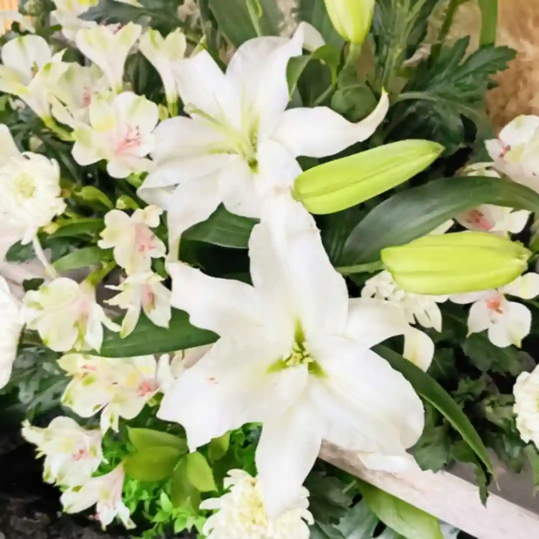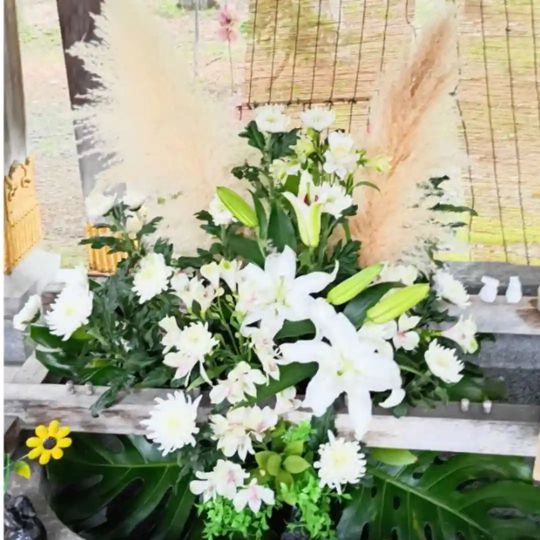 花手水の花が新しくなりました!白ユリ・白菊など白を基調とした色となっています。