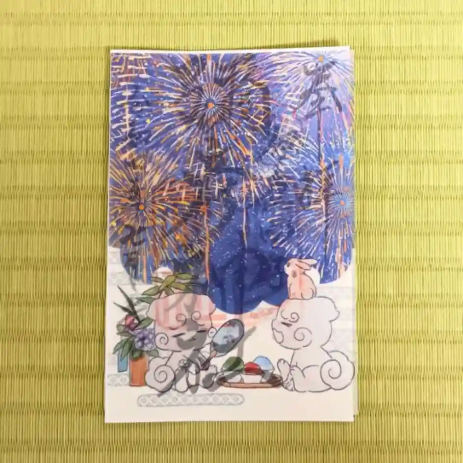 まるで天の川に咲いた花のように夜空を彩る花火と、夏の夜を楽しむ いやひこまいぬとウサギさんを描いた御朱印です。