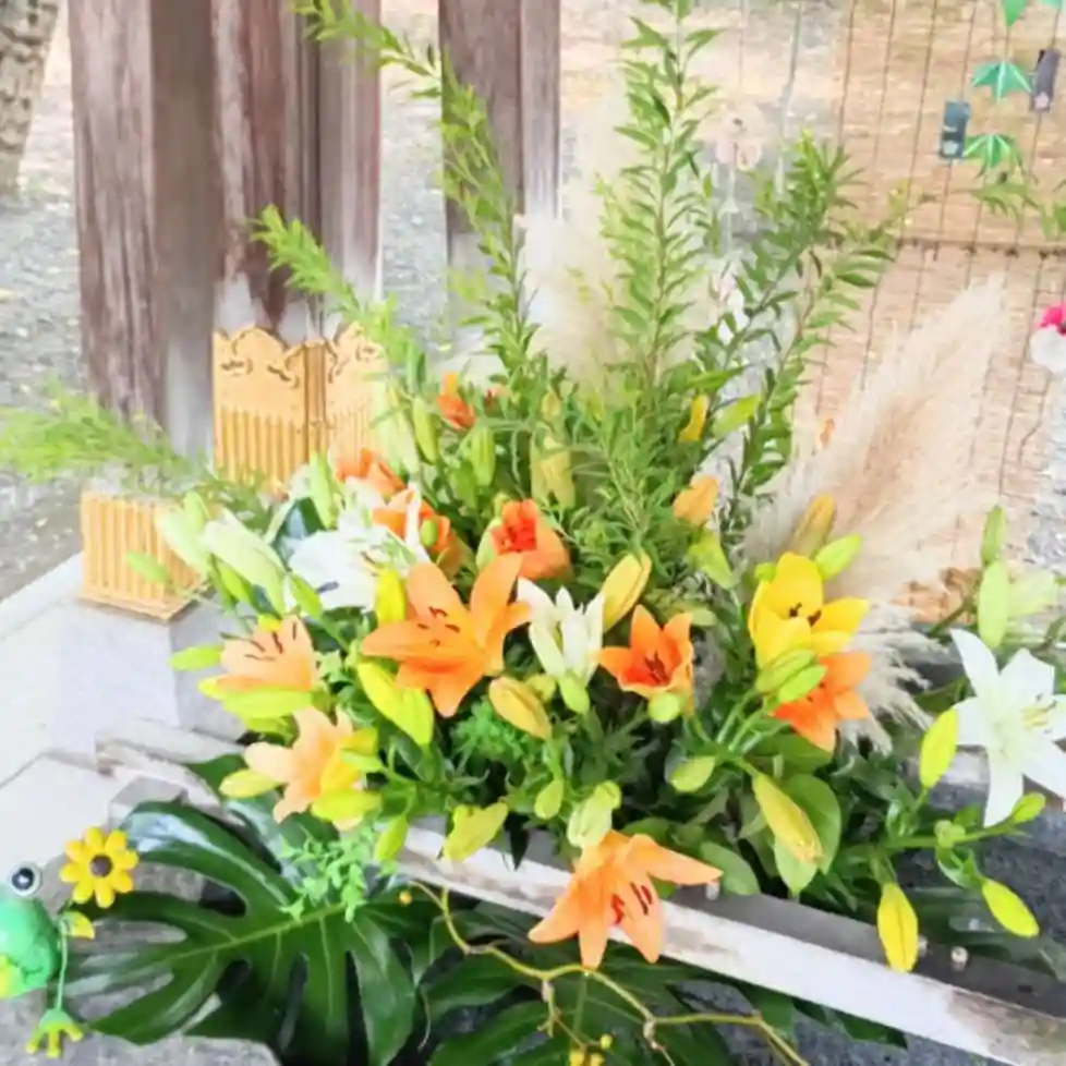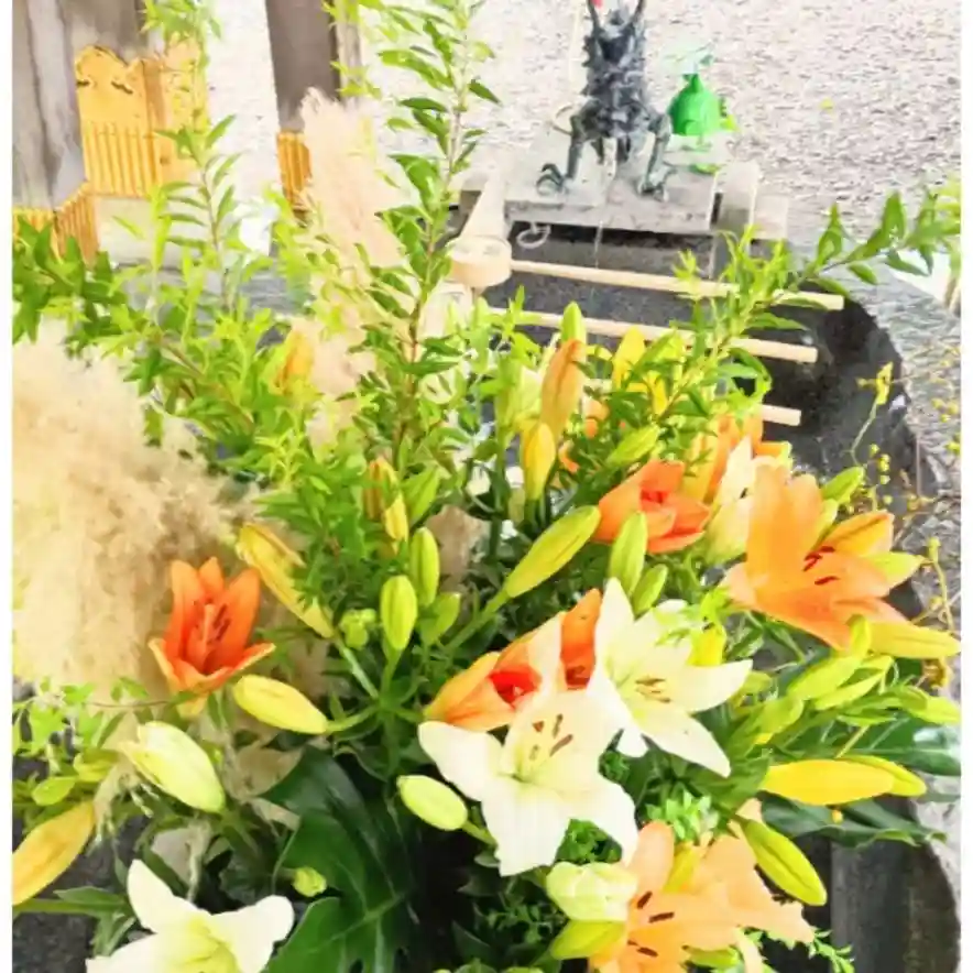 今回はユリのがたくさんあり、その他にも多くの花が手水を彩ってくれています!