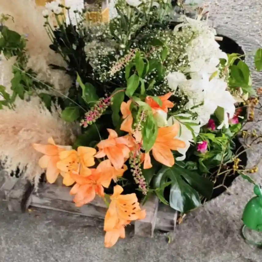 右半分は白いユリの花で、左半分はオレンジ色のユリの花と、見事に調和がとれていますね!