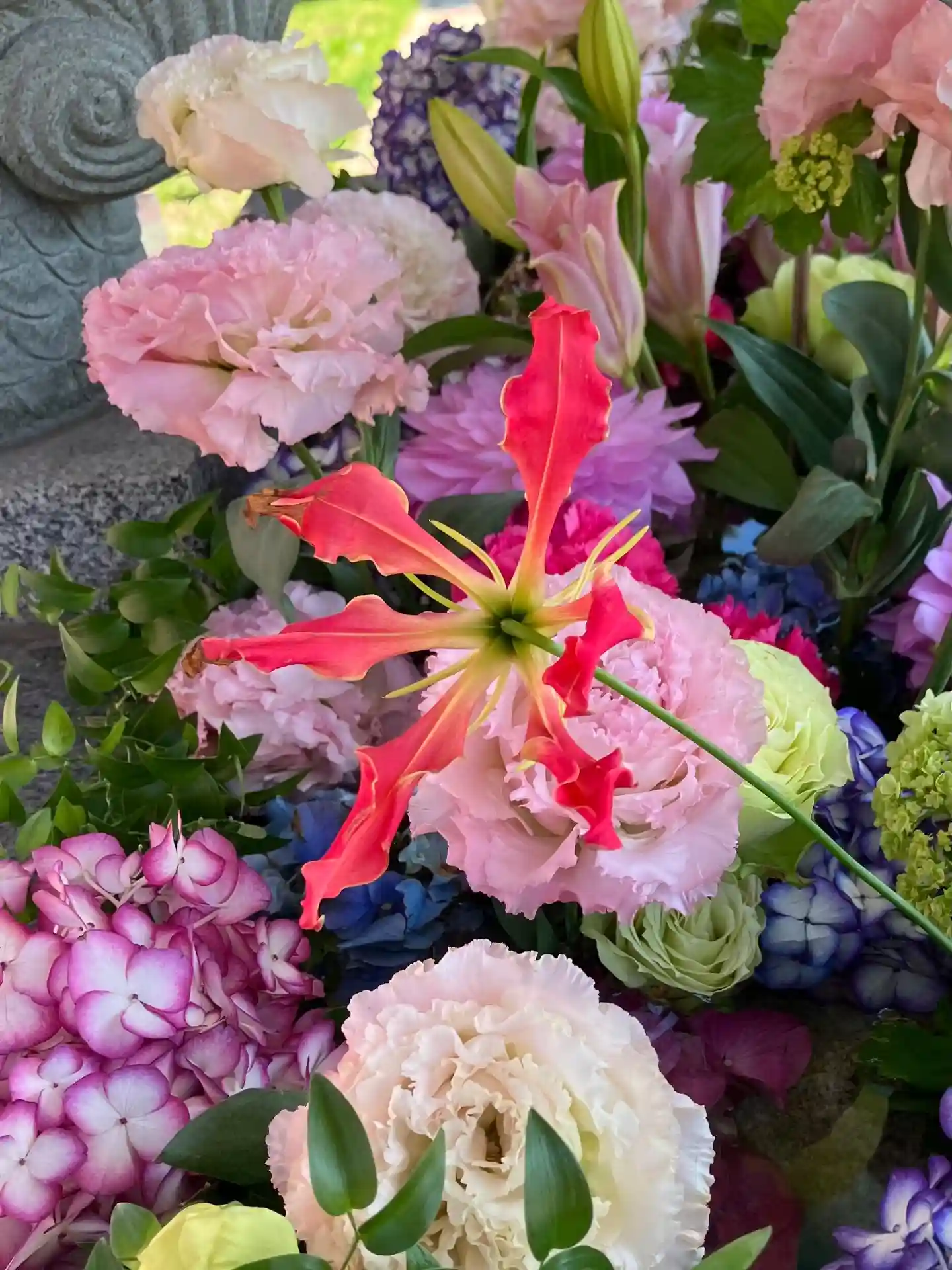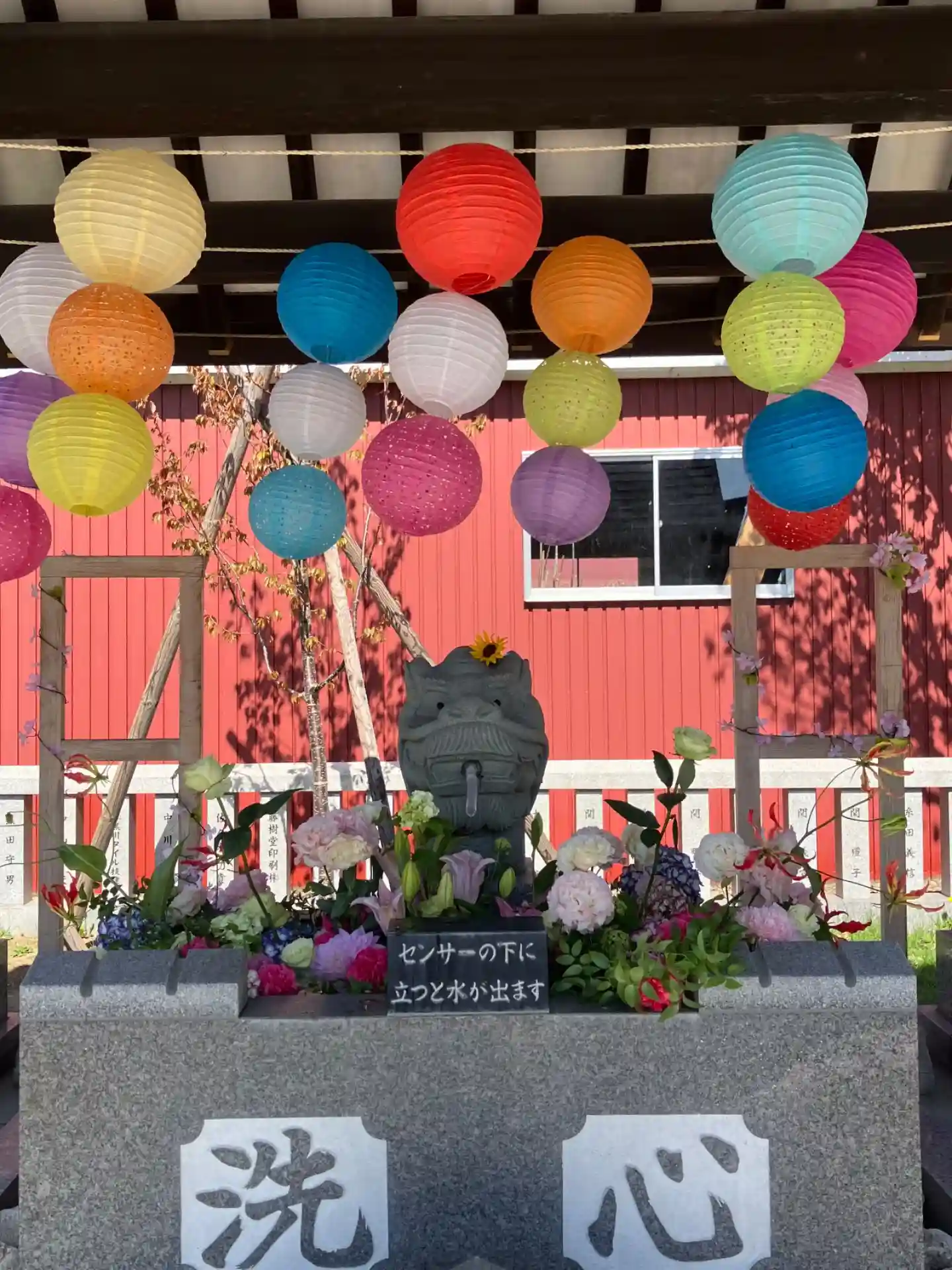 青空にきれいな花手水が映えます⛩️🎵