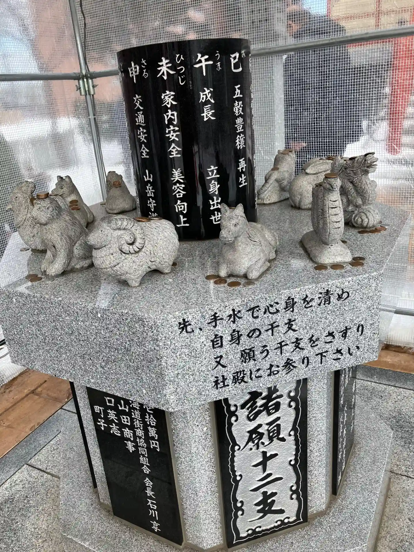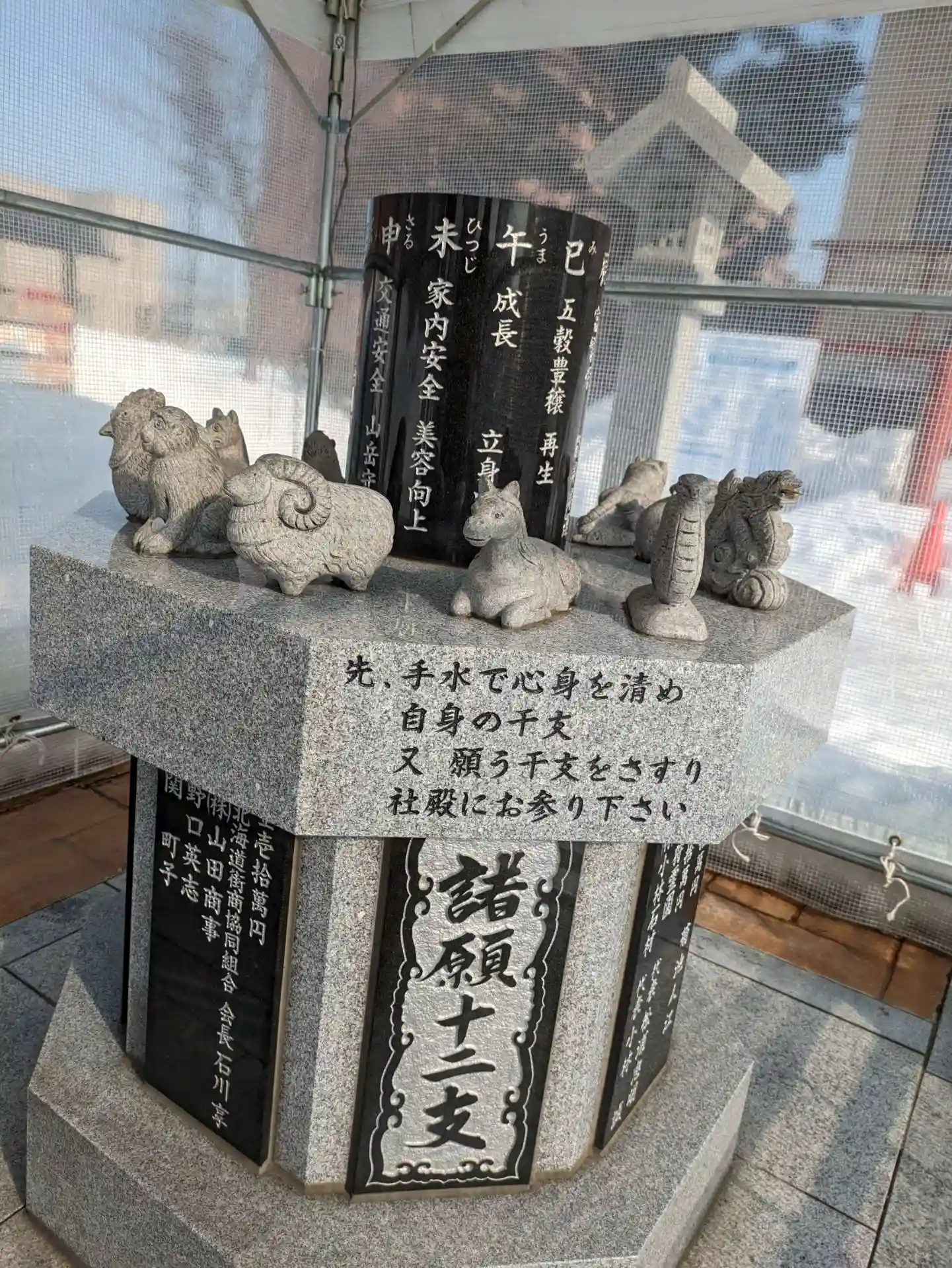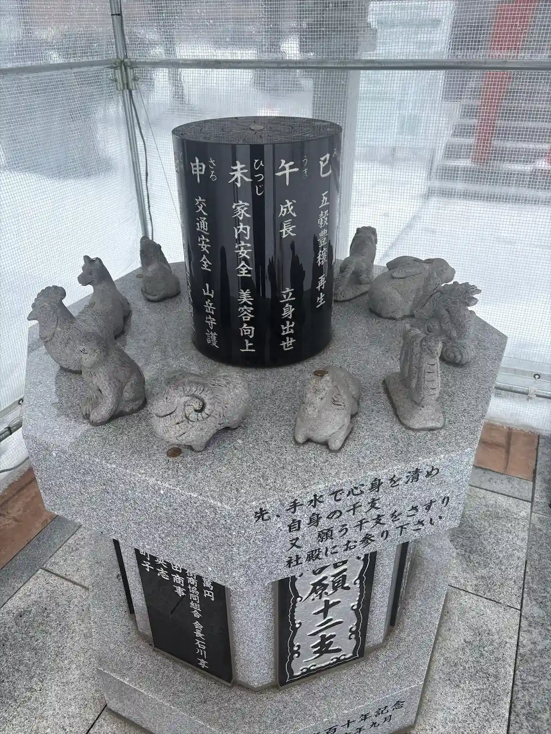 八方除け十二支像はテントの中にありました。手水舎に掲示されていた参拝方法に従って、自分の干支を撫でてから本殿で参拝しましたが、帰りに向かい干支もなでなで。
