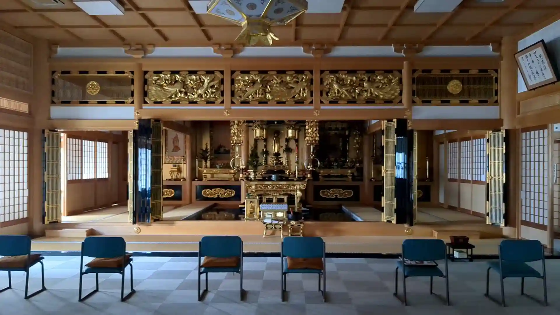 本堂は2階にありエレベーターや車イスなど体が不自由な方にも配慮されています。今年は戦後八十年。貼り紙に1995年の戦後五十年の年に真宗大谷派が決議した不戦決議が書かれていました。これからも戦争のない平和な世の中を願うばかりです。