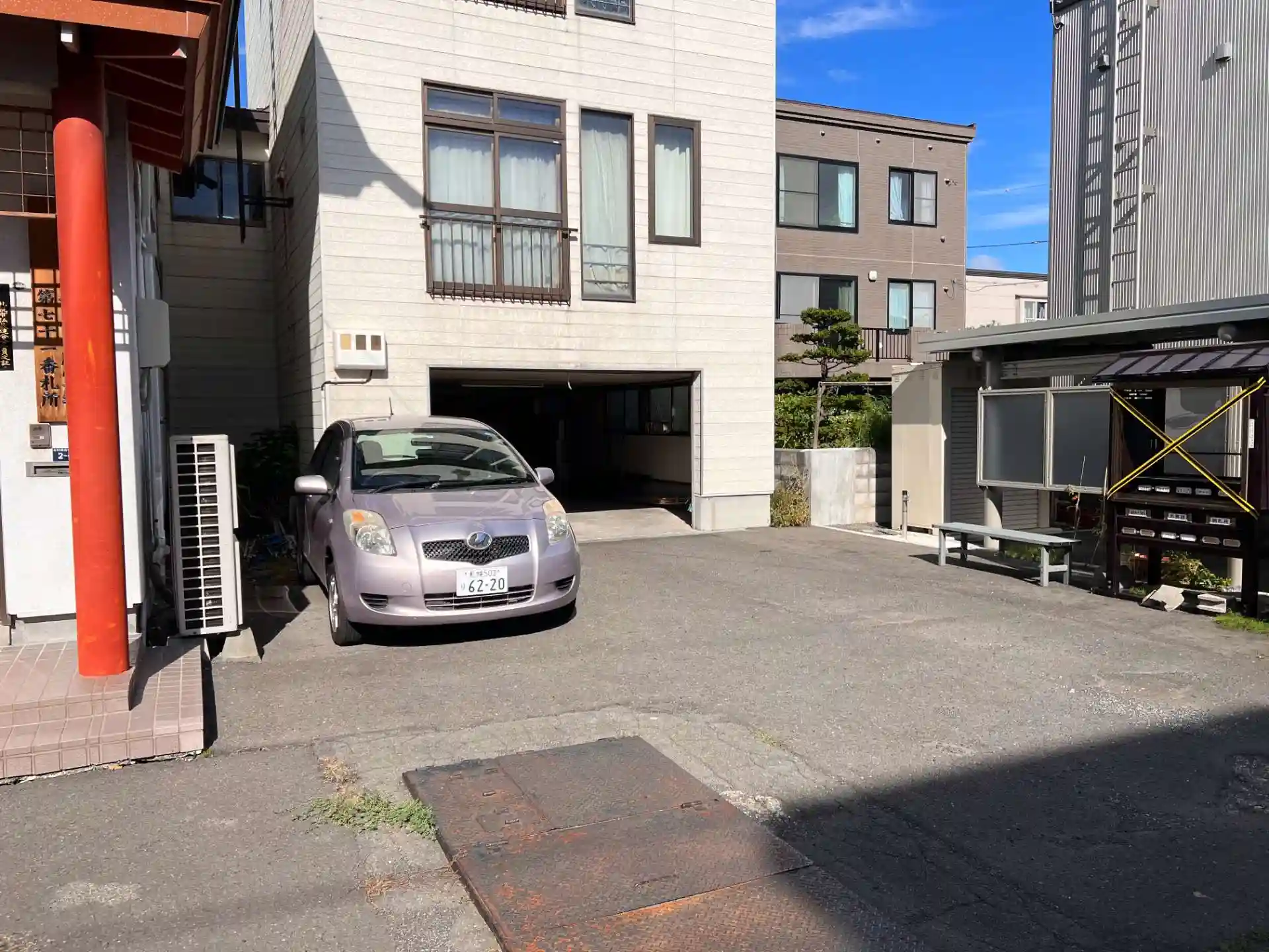 吉祥院さまの前の道路に「路上駐車」するか、吉祥院さま「車庫前」に駐めるしかありません(吉祥院さまの車が駐まっていますが)。