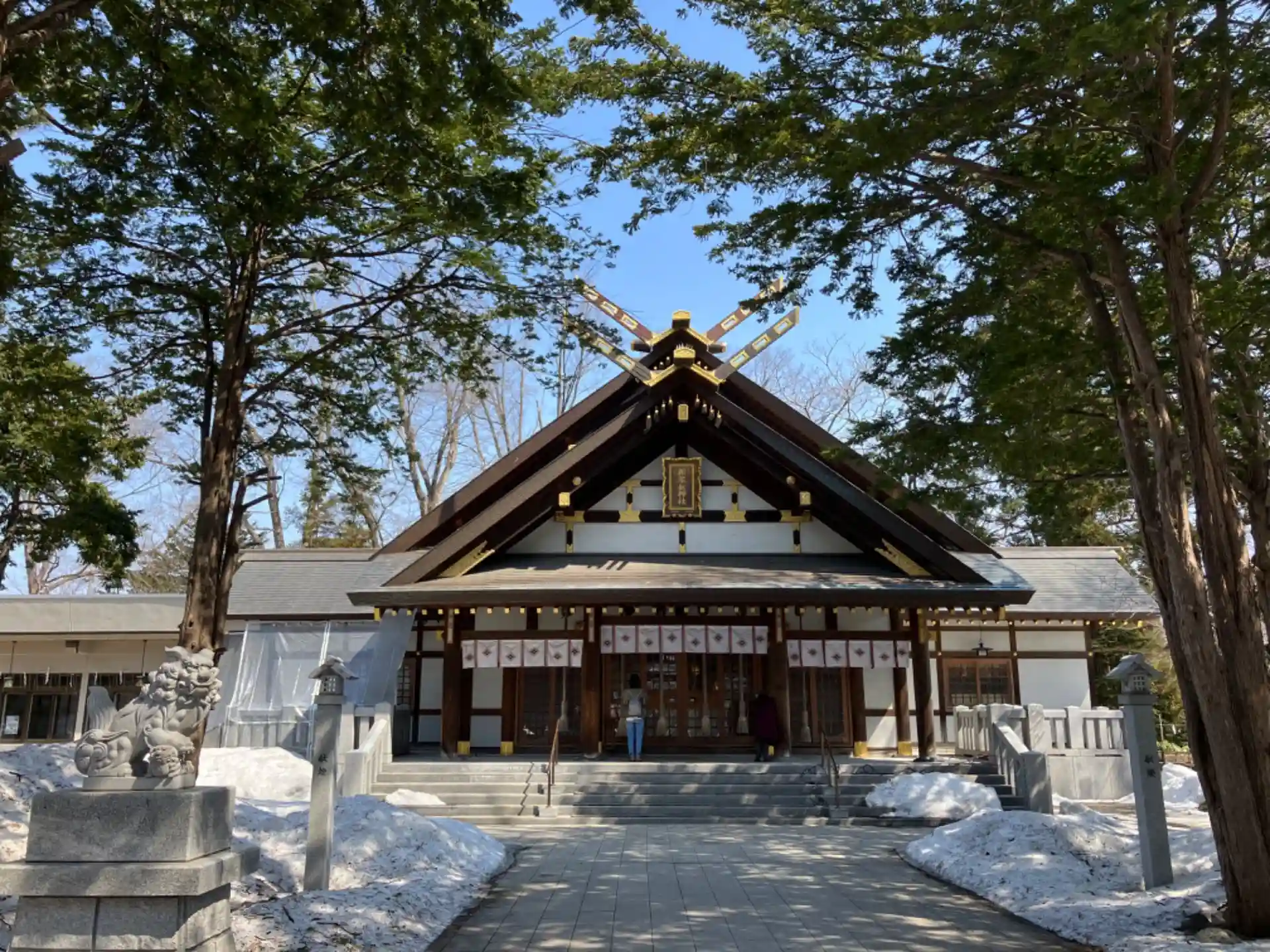 拝殿横の石碑エリアはまだ少し雪が残っています