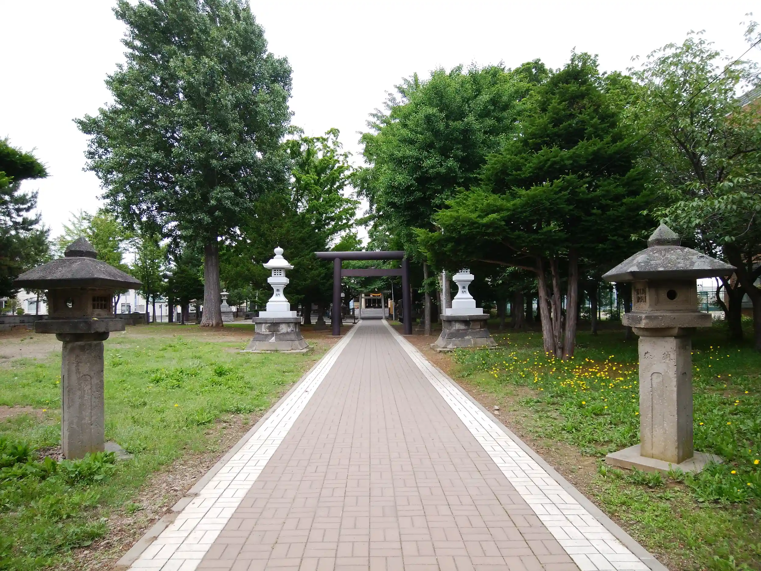 神社鳥居前の歩道もナチュラルなお花畑みたいに素敵♪